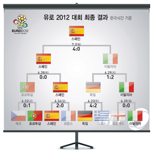 스페인이 이탈리아를 4-0으로 대파하고 '앙리 들로네컵(유로 우승컵)'을 들어올렸다. 이로써 스페인은 유로 대회 2연패와 메이저대회 3연속 우승이라는 전인미답의 위업을 달성했다. 유로 대회를 연속으로 제패한 나라는 지금까지 없었다.