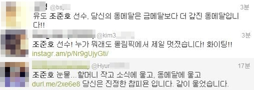 한 트위터리안(@bs***)은 "유도 조준호 선수, 당신의 동메달은 금메달보다 더 값진 동메달입니다"라고 썼고, '@kim3*****'은 "누가 뭐래도 올림픽에서 제일 멋졌습니다!"라고 트윗했다.