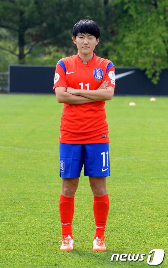 (파주=뉴스1) 이동원 기자 2014 아시아축구연맹(AFC) 여자 아시안컵 대회에 참가하는 대표팀 감독과 선수들이 7일 오후 경기도 파주 NFC(국가대표 트레이닝센터)에서 미디어 포토데이 행사를 가졌다. 김수연이 취재진을 향해 포즈를 취하고 있다.2014.5.7/뉴스1