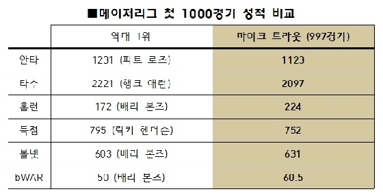 18일(이하 한국시간)까지 커리어 통산 997경기에 나선 트라웃은 19~20일 애리조나 다이아몬드백스와의 두 경기에 출전한다면 오는 22일 토론토 블루제이스와의 홈경기가 자신의 통산 1천번째 메이저리그 경기가 된다.