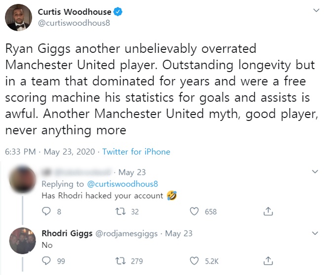 우드하우스는 지난 23일(한국시간) 자신의 트위터에 "긱스는 지난 50년 동안 가장 과대평가된 선수일 것"이라고 평가했다.