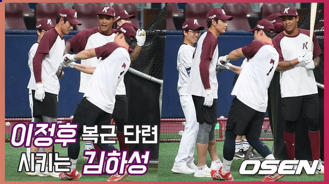 키움 김하성과 이정후, 러셀을 비롯한 키움 선수들이 그라운드 위에서 타격훈련을 기다리던 중 김하성이 배트로 이정후의 배를 건드리며 장난을 치고 있다. /[email protected]