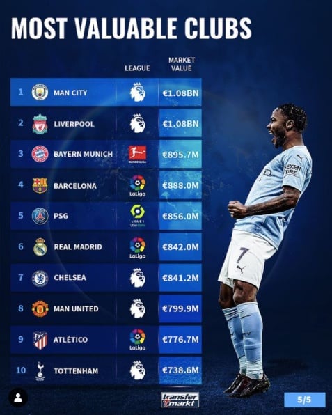 독일 바이에른 뮌헨이 8억 9570만 유로(약 1조 1878억 원)로 3위, 스페인 바르셀로나가 8억 8800만 유로(약 1조 1776억 원)로 4위, 프랑스 파리 생제르맹이 8억 5600만 유로(약 1조 1351억 원)로 5위에 올랐다.