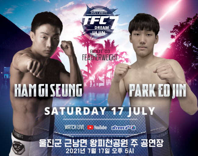 'TFC 드림 7'은 오는 17일 오후 5시부터 경북 울진군 근남면 왕피천공원 주공연장에서 펼쳐진다. 오프닝매치 1경기, 언더카드 4경기와 메인카드 8경기로 구성돼있다. 메인카드는 5분 3라운드, 언더 카드는 5분 2라운드다. 웰터급 스페셜매치 박지원-박준현戰은 5분 2라운드로 펼쳐진다.
