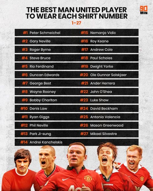 영국 축구 전문매체인 90min은 11일(한국시간) 공식 SNS에 맨유 역대 최고의 등번호 1~27번을 선정했다.