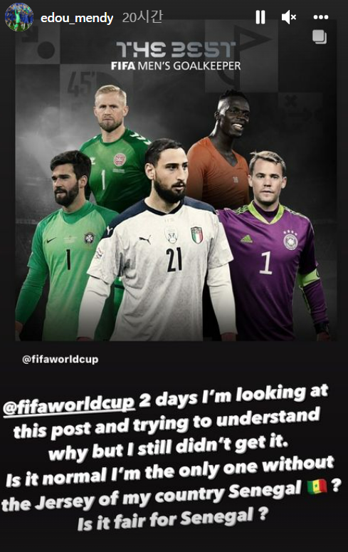 첼시의 골키퍼 에두아르 멘디는 24일(한국시간) 자신의 개인 SNS를 통해 FIFA를 향해 불만을 드러냈다. FIFA는 앞서 공식 SNS에 최우수 골키퍼 후보들의 사진을 게시했다. 카스퍼 슈마이켈(35, 덴마크), 알베송 베케르(29, 브라질), 지안루이지 돈나룸마(22, 이탈리아), 마누엘 노이어(35, 독일)가 멘디와 함께 후보에 올랐다.