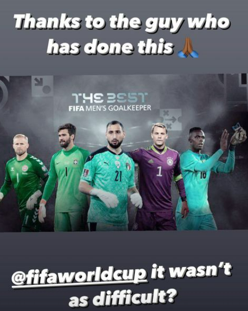 잠시 후, 멘디는 다른 게시물을 올렸다. 한 팬이 대표팀 유니폼을 입고 있는 멘디의 사진으로 새롭게 최우수 골키퍼 후보 사진을 올린 것이다. 이에 멘디는 "이런 작업을 진행해준 누군가에게 고마움을 표한다"라며 "FIFA는 이게 어려운가?"라며 비꼬았다.