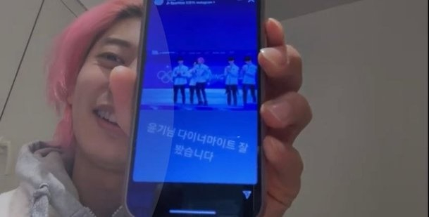 RM은 17일 인스타그램 스토리에 "윤기님 다이너마이트 잘 봤습니다"라며 곽윤기가 전날 쇼트트랙 남자 5000m 계주 간이 시상식에서 세리머니를 펼치고 있는 사진을 올렸다.
