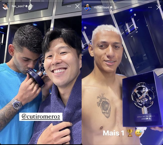 그런데 이 POTM 트로피의 기쁨을 손흥민보다 더 만끽하는 선수들이 있었다. 손흥민의 소셜미디어 계정을 보면 크리스티안 로메로가 이 트로피에 입을 맞추고 있다. 이 모습을 손흥민이 즐거운 듯 '셀카'로 찍어 남겼다.