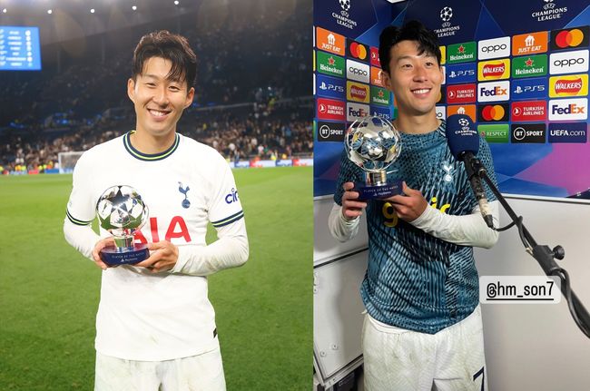 [OSEN=강필주 기자] 손흥민(30, 토트넘)이 최고 활약을 펼친 끝에 유럽축구연맹(UEFA)이 선정하는 경기 MVP인 'POTM(Player of the match)' 트로피를 받아들었다.