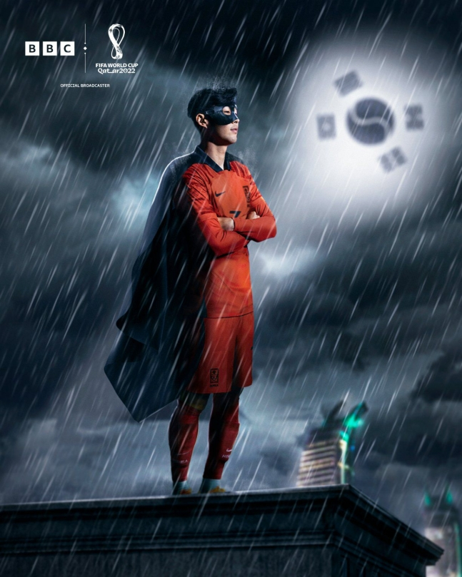 BBC 스포츠 트위터에 3일(현지 시간) 올라온 사진 한 장이다. 이날 포르투갈을 2-1로 꺾고 16강 진출을 확정지은 대한민국 대표팀, 그중에서도 결정적 도움을 준 손흥민을 슈퍼히어로에 빗대 올린 거였다.