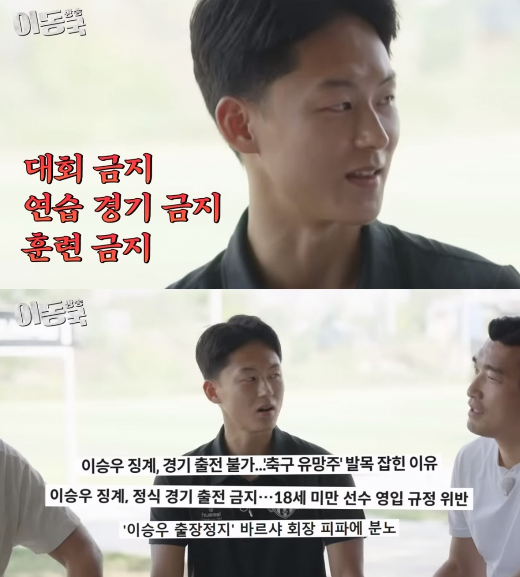 이승우는 "어릴 때 FIFA 징계에 걸려 2~3년 동안 (축구를 못하고) 쉬었다"며 "FIFA는 만 18세 이하 선수의 해외 이적을 규정으로 금지하고 있다. 당시 저는 스페인에서 16세 때 이미 5년 프로 계약을 했었다"고 밝혔다.
