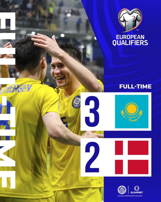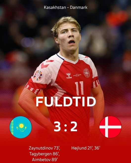 덴마크는 26일(한국시간) 카자흐스탄 아스타나 아레나에서 열린 유럽축구연맹(UEFA) 유럽축구선수권대회(유로 2024) 예선 조별리그 H조 2차전에서 카자흐스탄에 2-3으로 역전패했다.
