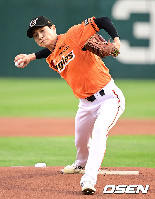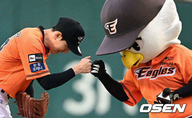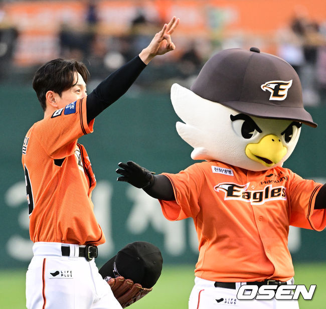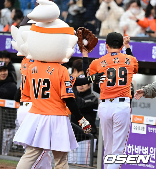 그리고 한화 마스코트 위니에게 글러브와 볼을 건네받은 정성일은 긴장한 내색 없이 잠시 몸을 풀더니 바로 볼을 뿌렸다.