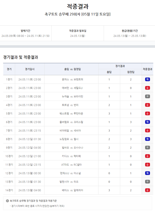 스포츠토토의 공식 인터넷 발매사이트 베트맨에서 5월 13일(월) 발표한 적중결과에 따르면, 축구토토 승무패 29회차에서 14경기를 모두 맞혀야 하는 1등은 64건이 발생했다. 1등 적중금은 총 21억 8,432만 2,250원이며, 건당 개별 환급금액은 3,413만 40원이다.