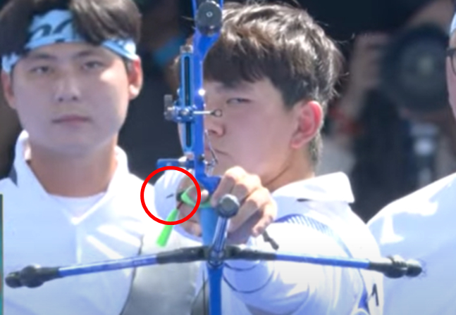 화제의 장면은 중국과의 준결승에서 나왔다. 한국이 세트 스코어 3-1로 앞선 가운데 맞이한 3세트. 중국이 6발을 모두 쏜 결과 53점을 얻은 뒤 한국은 이우석이 4번째 발에서 9점을 기록해 스코어는 36-53이 됐다.