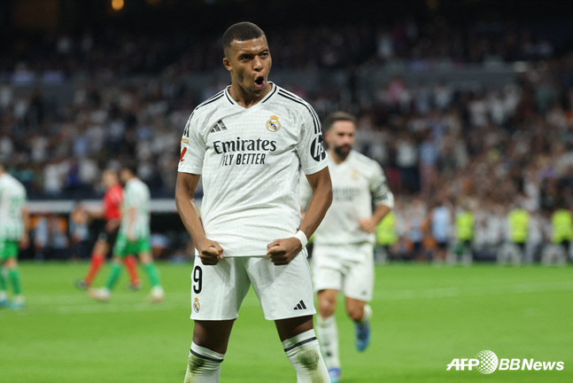 레알은 2일(한국시간) 스페인 마드리드의 산티아고 베르나베우에서 열린 2024~2025 스페인 프리메라리가 4라운드 레알 베티스와 홈경기에서 2-0 승리를 거뒀다. '이적생' 음바페가 홀로 2골을 책임졌다. 승점 3을 추가한 레알은 2승2무(승점 8)를 기록, 조 2위에 올랐다. 선두 바르셀로나(4승·승점 12)를 추격하고 있다.