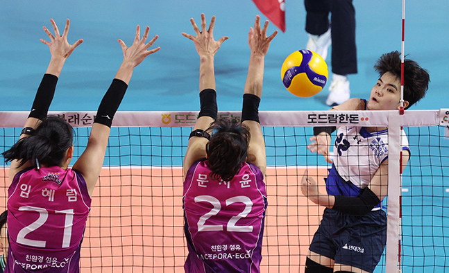 도드람 2024-2025 V리그 여자부 흥국생명-현대건설전이 6일 인천삼산월드체육관에서 열렸다. 현대건설 서지혜가 흥국생명 임혜림 문지윤의 더블 블로킹 위로 강스파이크를 날리고 있다. 독자들의 PICK! "'음주 뺑소니' 지상렬이 대리운전 모델?" 26년 전 사건 파묘 "남친에 4억 뜯겨" 여배우 충격에...은둔 생활→고깃집 서빙 "남경주, 애처가·딸바보였는데"…성폭행 혐의 '충격' 한고은, '7년째 무직' 남편과 부부싸움…"일주일 한번씩 다퉈"
