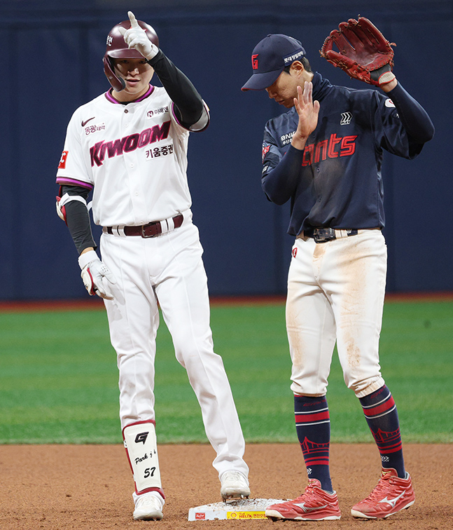 2025 신한 SOL Bank KBO리그 시범경기 키움 히어로즈 대 롯데 자이언츠 경기가 18일 고척 스카이돔에서 열렸다. 키움 박주홍이 5회말 2사 1루에서 동점 1타점 적시 2루타를 날리고 출루한 후 세리머니를 선보이고 있다. 독자들의 PICK! 100만원도 못 벌던 개그맨..."수입 1000배" 변호사 된 깜짝 근황 "조진웅, 은퇴할 줄 몰랐다…식사 제안도 거절" 정지영 감독이 전한 근황 치어리더 정가예 "폭언·욕설에 병원 치료→활동 중단" 무슨 일? "새벽에 전화, 돈 요구" 김원희, 사생활 털렸다...해킹범이 협박