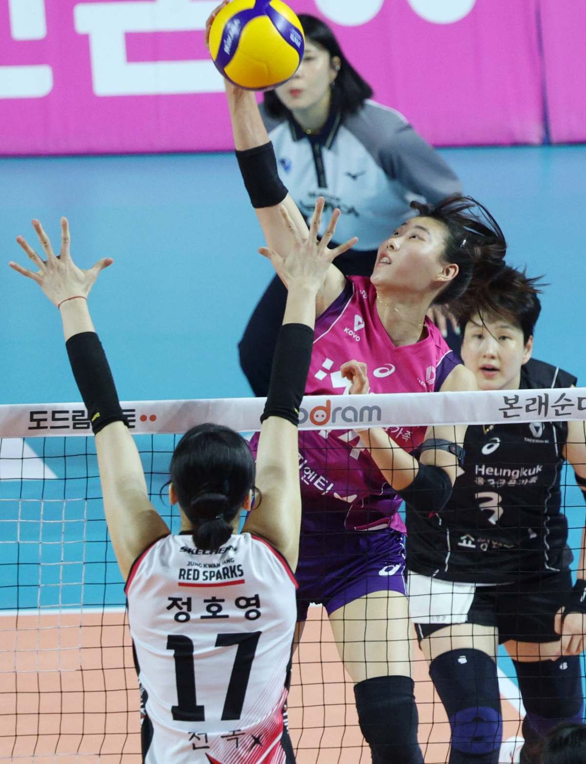 '도드람 2024~2025 V리그' 여자부 챔피언결정전 5차전 흥국생명 대 정관장 경기가 8일 인천 삼산월드체육관에서 열렸다. 흥국생명 정윤주가 정관장 정호영의 블로킹 위로 강스파이크를 날리고 있다. 독자들의 PICK! "만난 지 6년 5개월" 제니, 결혼 소식…사업가와 웨딩마치 "남친에 4억 뜯겨" 여배우 충격에...은둔 생활→고깃집 서빙 "남경주, 애처가·딸바보였는데"…성폭행 혐의 '충격' 한고은, '7년째 무직' 남편과 부부싸움…"일주일 한번씩 다퉈"