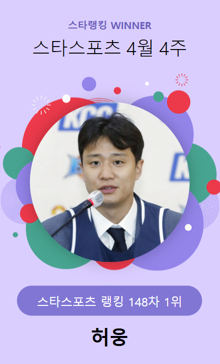 허웅은 스타뉴스가 지난 달 24일 오후 3시 1분부터 1일 오후 3시까지 일주일 동안 진행한 스타랭킹 스타스포츠 148차(4월 4주) 투표에서 1만 199표를 얻어 선두를 유지했다. 2022년 6월 30일 스타랭킹에 스포츠 부문이 추가된 이래 단 한 번도 정상을 내주지 않았다. KCC가 포스트시즌 진출에 실패해 이미 시즌을 마감했음에도 득표 수가 지난 주 8671표에서 오히려 17.6% 증가하는 저력을 과시했다.