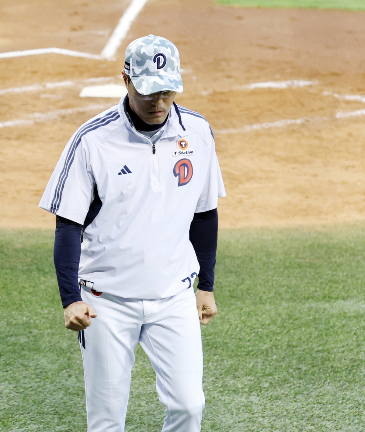 두산 조성환 감독대행이 5일 잠실구장에서 열리는 2025KBO리그 두산베어스와 KIA타이거즈 경기 4회말 김인태 스트라이크아웃 낫아웃 판정에 어필하고 있다. 2025.06.05.