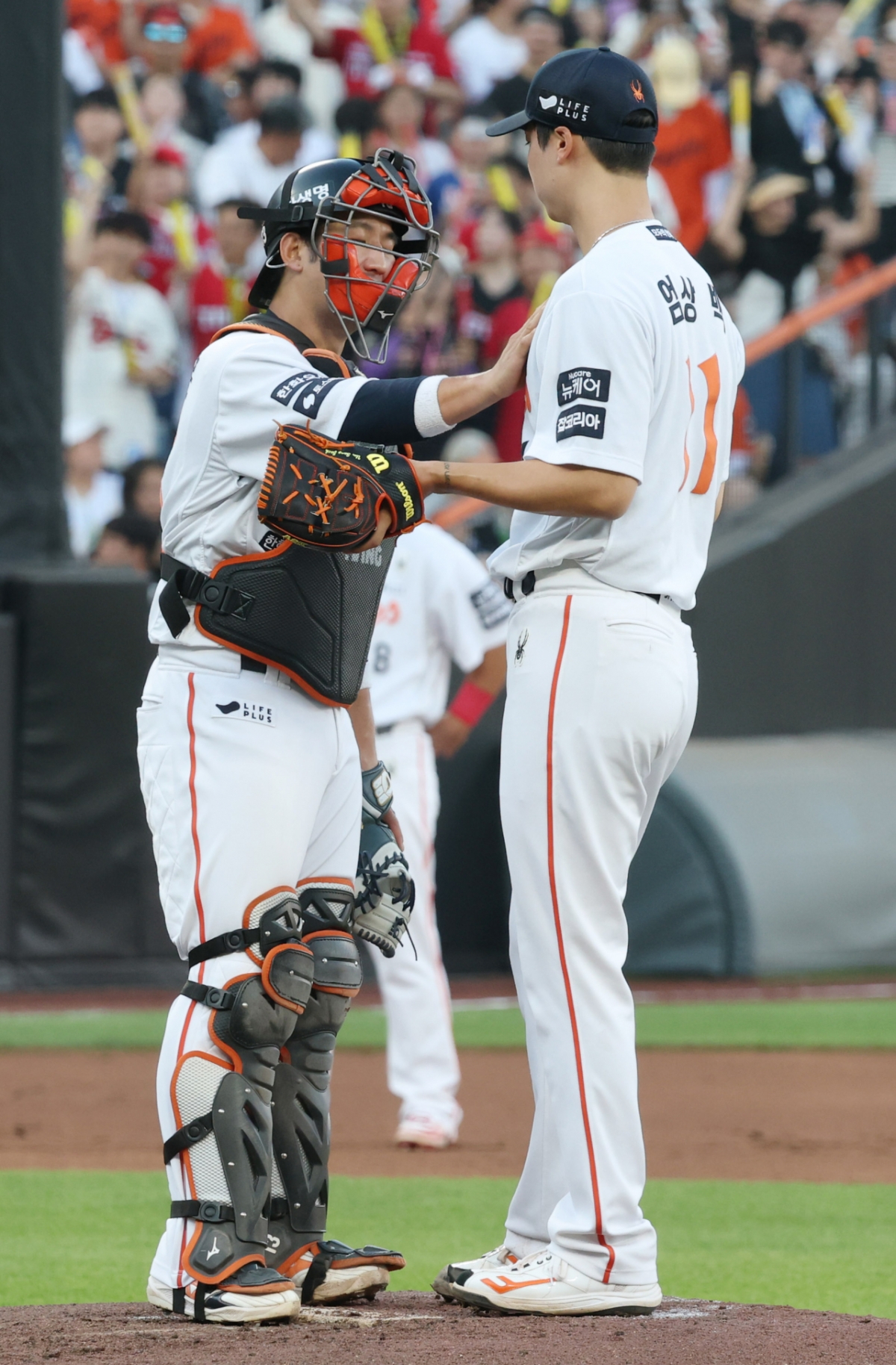 2025 신한 SOL Bank KBO리그 한화 이글스 대 KIA 타이거즈 경기가 9일 대전 한화생명 볼파크에서 열렸다. 한화 선발 엄상백이 2회 흔들리는 모습을 보이자 포수 최재훈이 마운드로 가 진정시키고 있다. 독자들의 PICK! '성매매 논란' 지나, 결혼·출산?…웨딩드레스 이어 유모차까지 100만원도 못 벌던 개그맨..."수입 1000배" 변호사 된 깜짝 근황 엄마 출근하면 돌변한 아빠...'미성년' 의붓딸 성폭행, 2살 친딸도 폭행 "제수씨와 잠자리를?" 초강수 질문…'친자확인' 남편, 끝내 결백 입증