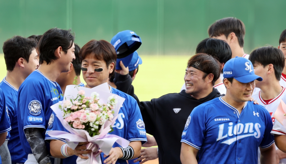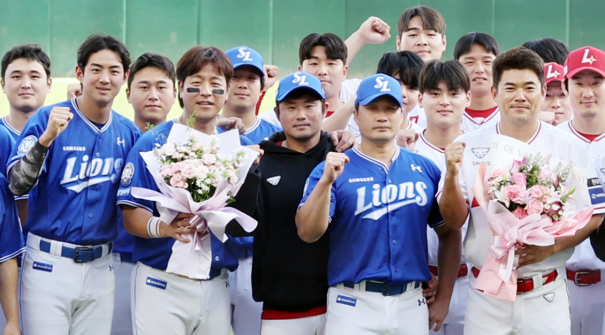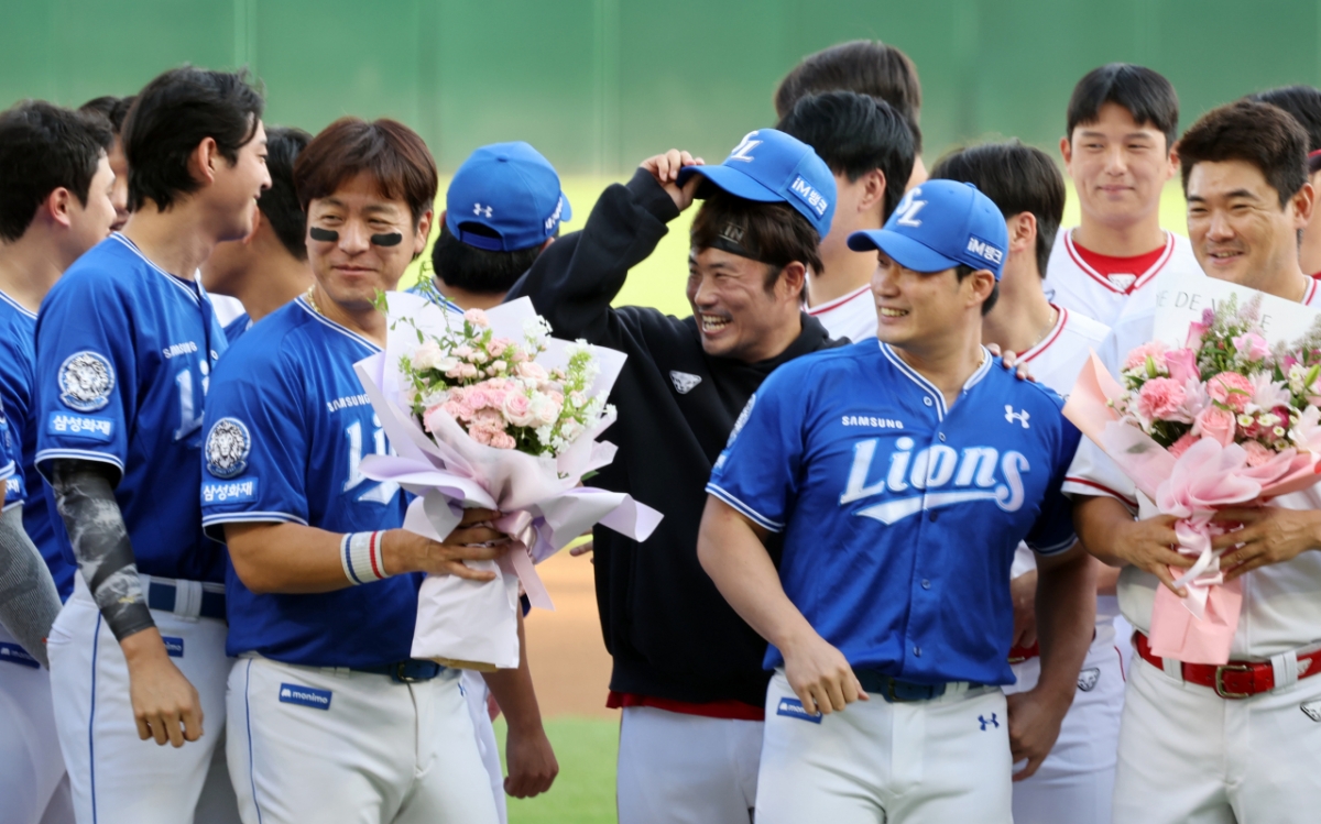 돌직구로 한국프로야구를 호령했던 삼성 오승환이 전격적으로 은퇴를 선언했다. 전날 은퇴발표를 한 오승환이 7일 인천SSG랜더스필드에서 열리는 2025 KBO리그 삼성라이온즈와 SSG랜더스 경기에서 SSG에서 준비한 은퇴기념행사에 참여해 선수단 기념촬영을 하고 있다. 그런데 오승환 뒤에 서있는 SSG 포수 이지영의 모자가 눈에 들어온다. 한때 오승환의 볼을 받는 포수였던 이지영이 삼성모자를 쓰고 기념촬영을 하고 있다.