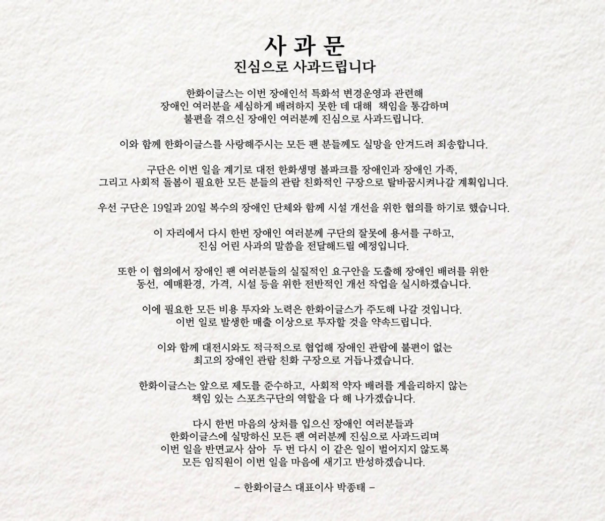 한화 구단은 19일 박종태 대표이사 명의로 "한화 이글스는 이번 장애인석 특화석 변경 운영과 관련해 장애인 여러분을 세심하게 배려하지 못한 데 대해 책임을 통감하며 불편을 겪으신 장애인 여러분께 진심으로 사과드립니다"라고 시작하는 사과문을 공식 발표했다.