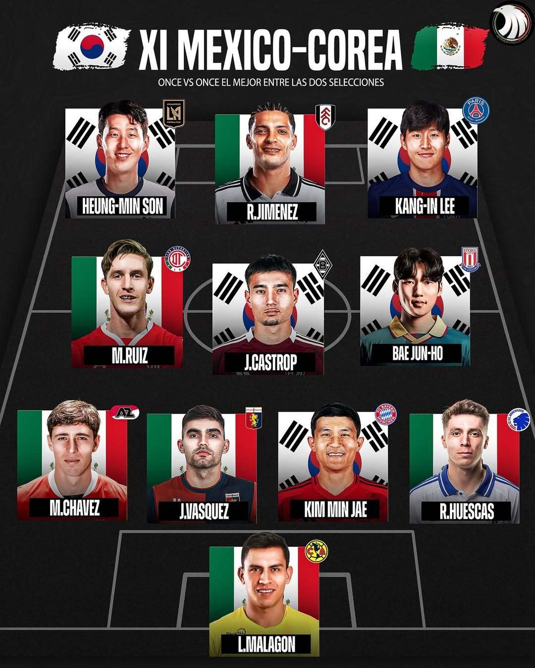 멕시코 매체가 맞대결을 앞둔 한국과 멕시코 축구대표팀의 선수들로 꾸린 '통합 베스트11'을 선정해 공개했다. 11명 가운데 한국 선수는 5명이 이름을 올렸다.