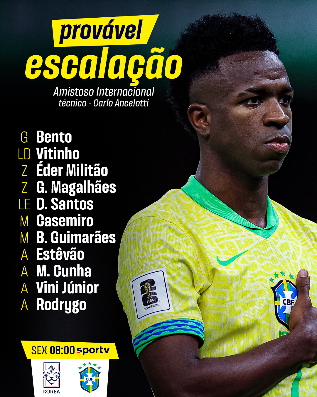 4명이 포진하게 될 공격진은 호드리구와 이스테방이 좌우 측면에 포진하고, 마테우스 쿠냐와 비니시우스 주니오르가 조금 더 중앙에서 한국 수비를 공략할 것으로 보인다. 글로부는 "안첼로티 감독은 경기 당일(10일) 오후 브리핑을 통해 선발 라인업을 확정할 예정인데, 훈련 과정에서 큰 의문을 남기진 않았다. 지난 파라과이전, 칠레전처럼 공격에서 활발한 움직임을 보이는 4-2-4 포메이션으로 복귀할 예정"이라고 내다봤다.