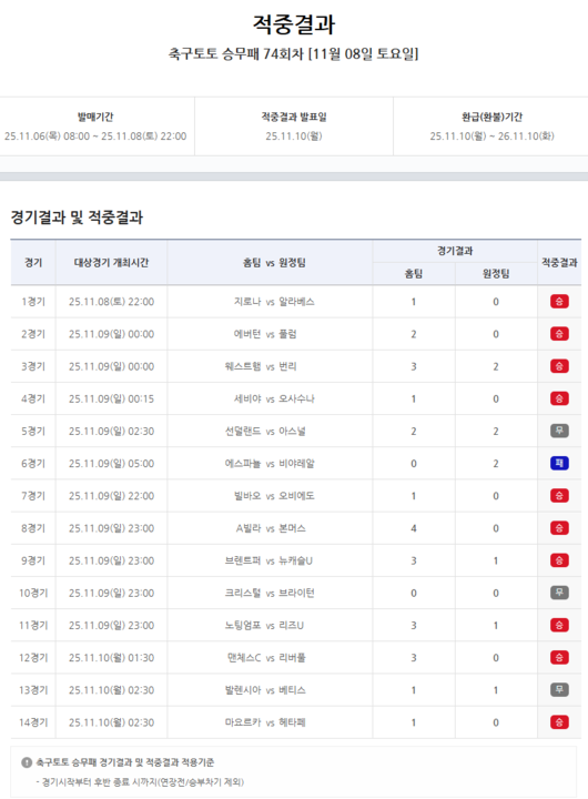 베트맨, 11월 10일(월) 축구토토 승무패 74회차 적중결과 발표…EPL, 라리가서 홈팀 강세