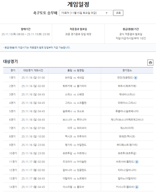 한편, 축구토토 승무패 75회차는 11월 13일(목) 오전 8시부터 15일(토) 오후 11시까지 발매되며, ▲브라질–세네갈(1경기), ▲튀르키예–불가리아(2경기), ▲스위스–스웨덴(3경기), ▲포르투갈–아르메니아(10경기) ▲이탈리아–노르웨이(13경기)전 등 2026 FIFA 북중미 월드컵 예선 및 A매치 평가전 경기들이 선정됐다.