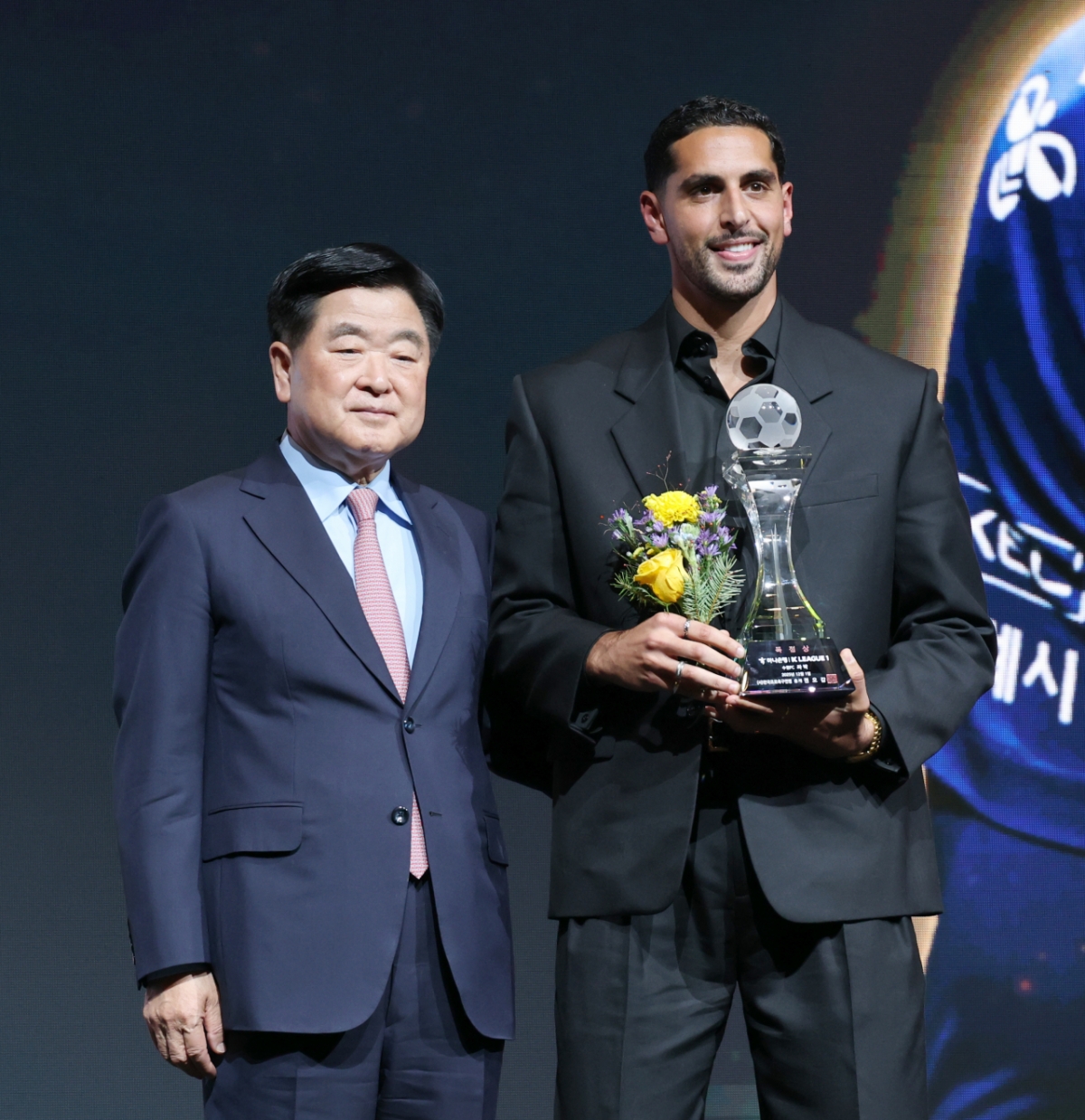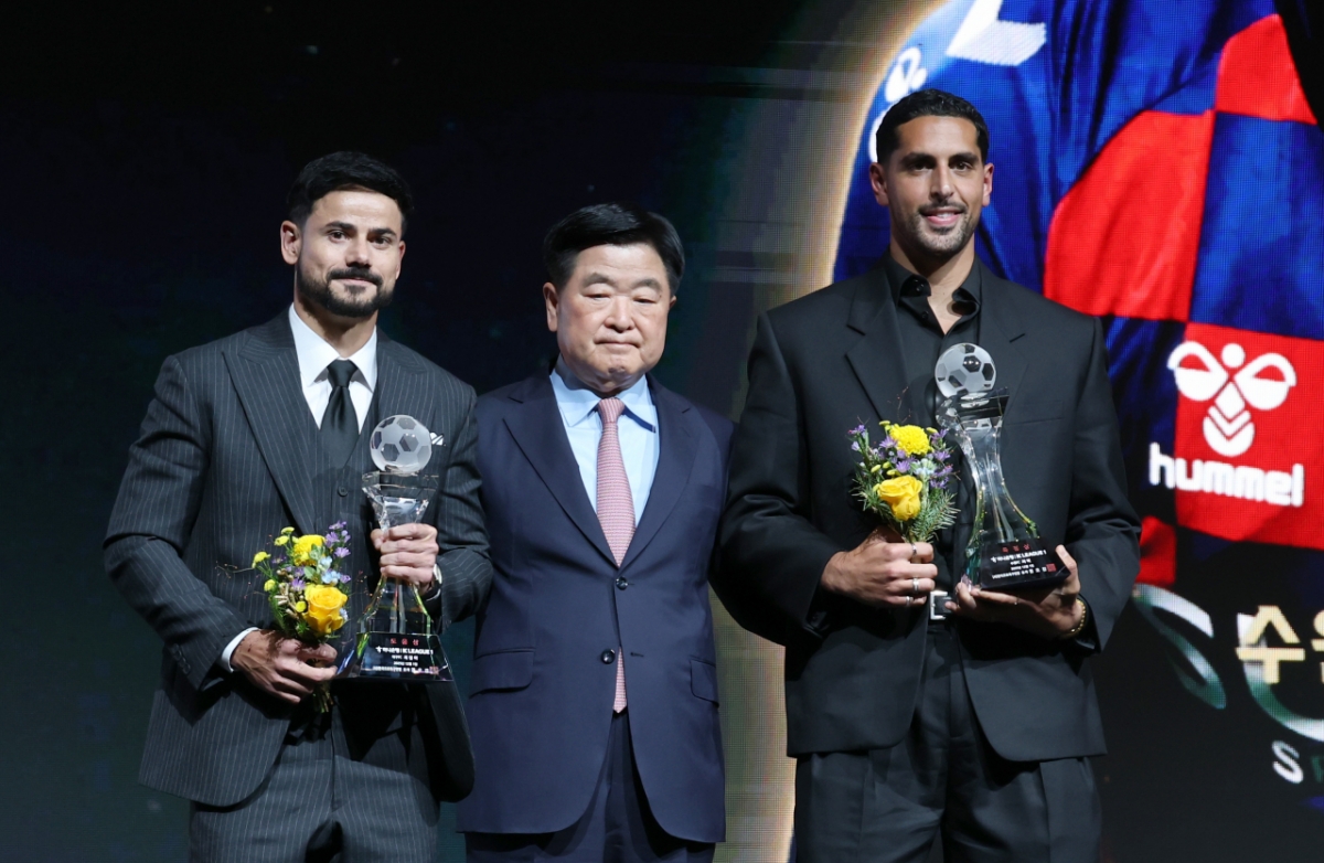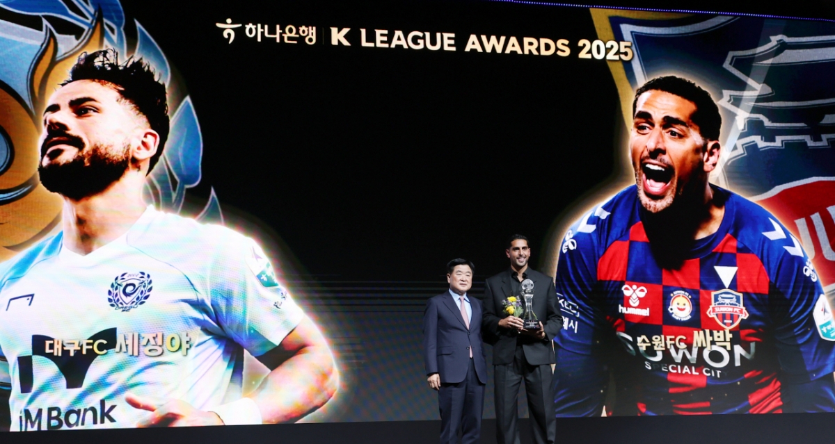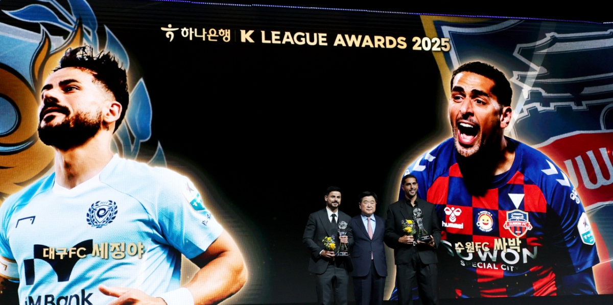 득점왕 싸박과 도움왕 세징야가 1일 서울 홍은동 스위스그랜드호텔에서 열린 하나은행 K리그 2025 대상시상식에서 공로상을 수상후 권오갑 프로축구연맹 총재와 기념촬영을 하고 있다. 한국프로축구연맹은 1일 오전 베스트 11에 선정된 송범근(전북), 이명재(대전), 야잔(서울), 홍정호(전북), 김문환(대전), 송민규(전북), 김진규(전북), 박진섭(전북), 강상윤(전북), 이동경(울산), 싸박(수원FC) 11명의 명단을 발표했다. 2025.12.01.