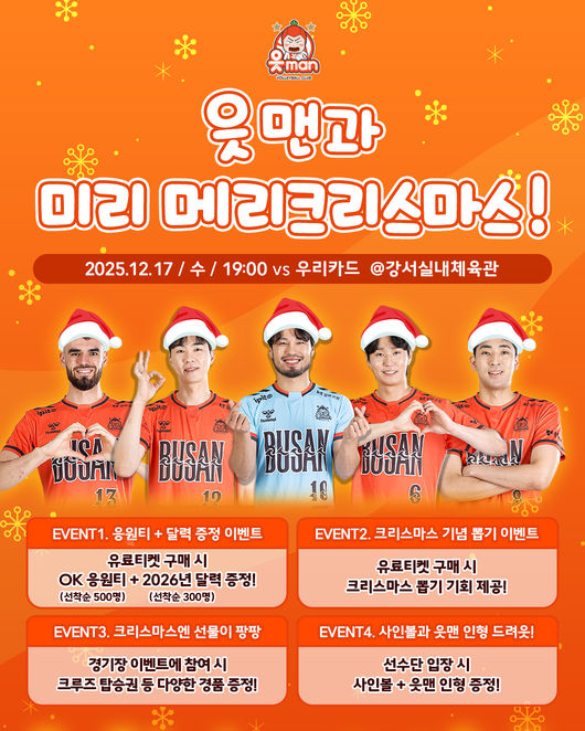 [OSEN=이후광 기자] OK저축은행 읏맨 프로배구단이 17일 부산 강서실내체육관에서 열리는 진에어 2025-2026 V-리그 3라운드 우리카드와 홈경기에서 크리스마스 분위기를 담은 다양한 팬 참여 이벤트를 진행한다.