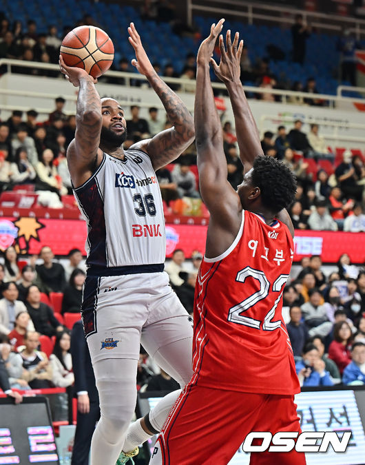 부산 KCC 숀롱이 울산 현대모비스 존 이그부누의 마크를 피해 골밑슛을 시도하고 있다. 2026.01.06 / [email protected]