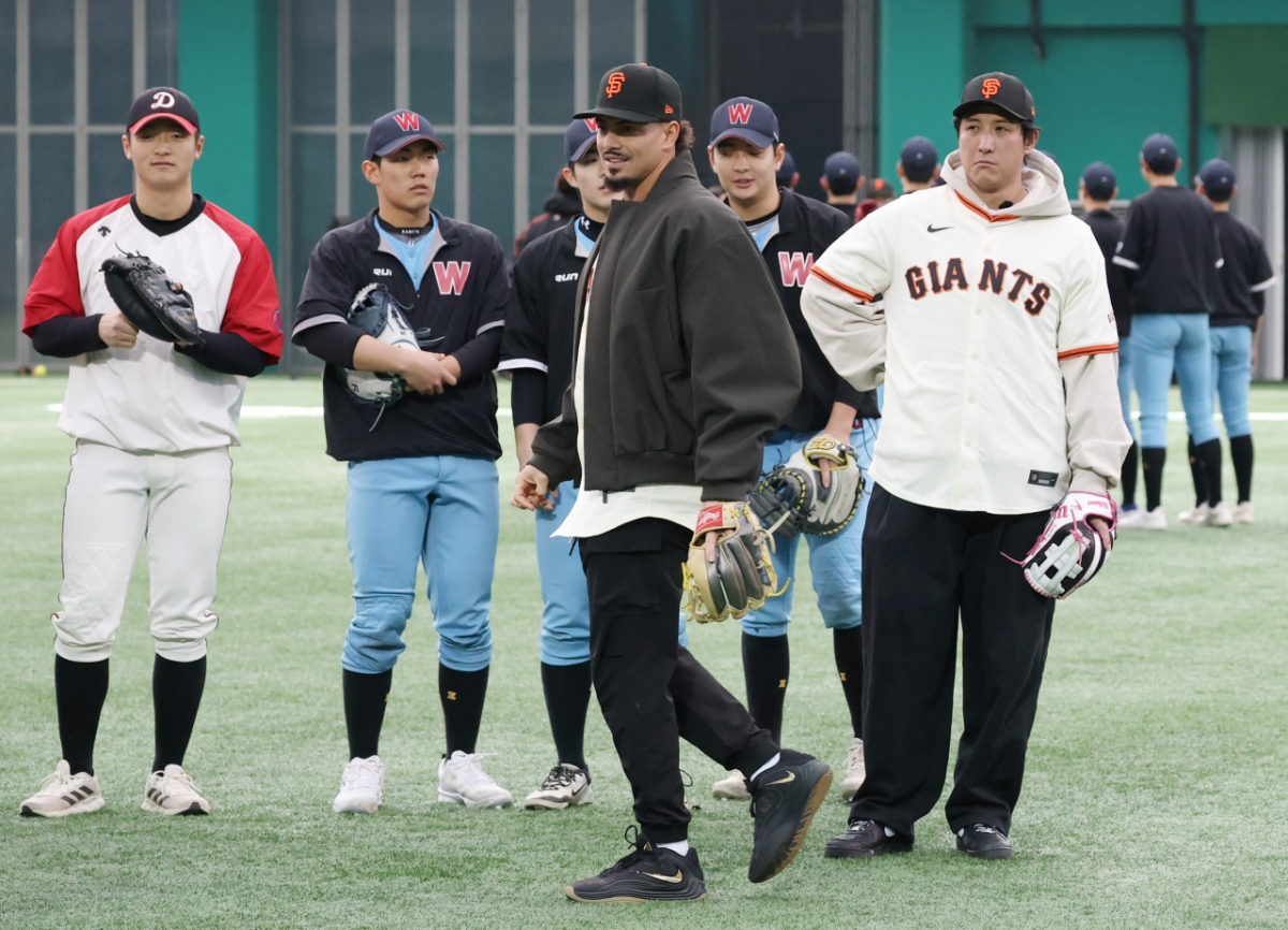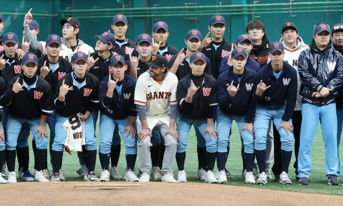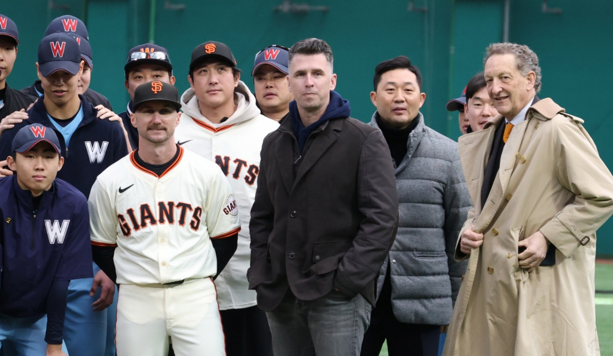 황재균이 7일 경기 이천 LG 챔피언스파크에서 진행한 샌프란시스코 야구 클리닉 행사에 토니 바이텔로 감독, 셰인 로빈슨 코치, 이정후, 윌리 아다메스 등과 함께 휘문고 덕수고 후배들을 지도했다.