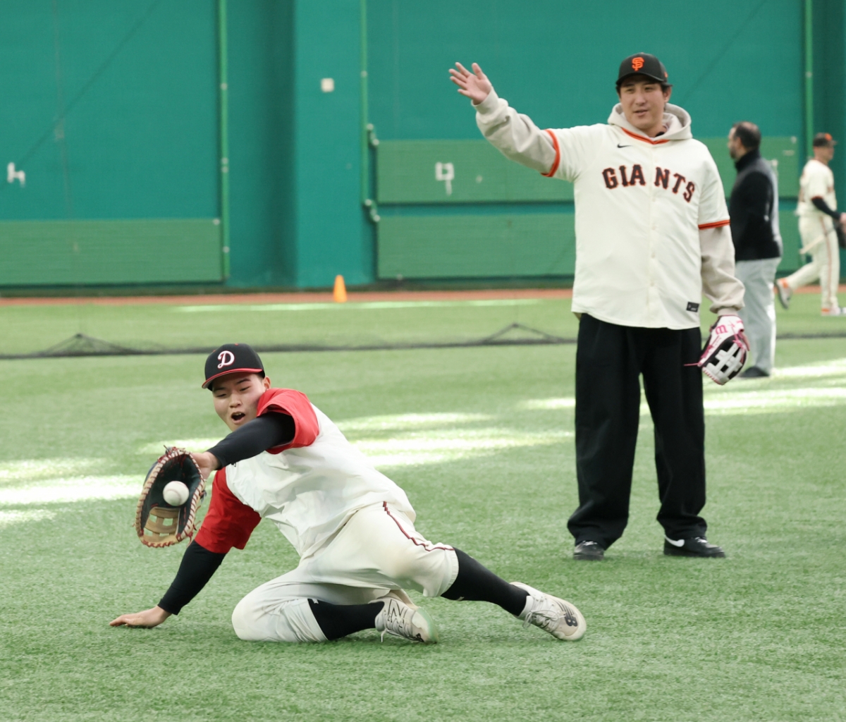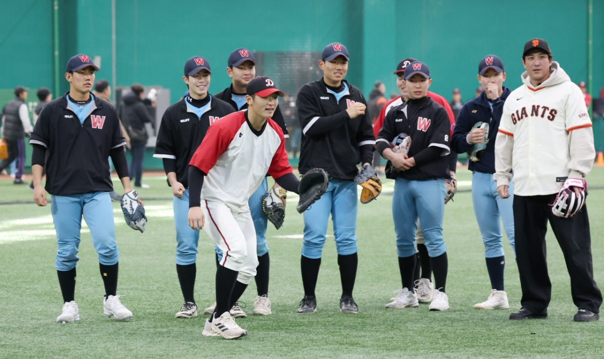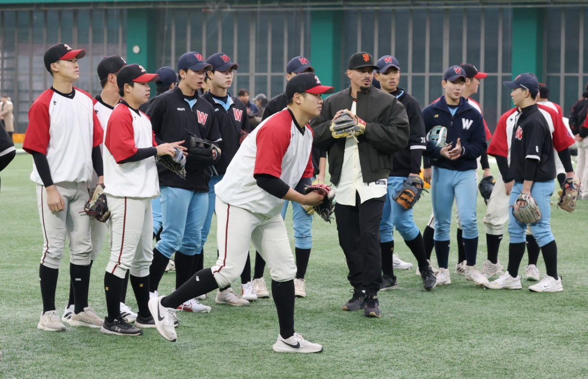 황재균은 이날 아다메스와 팀을 나눠 후배들의 수비 훈련을 내기하듯이 재미있게 진행하며 웃음을 선사했다.