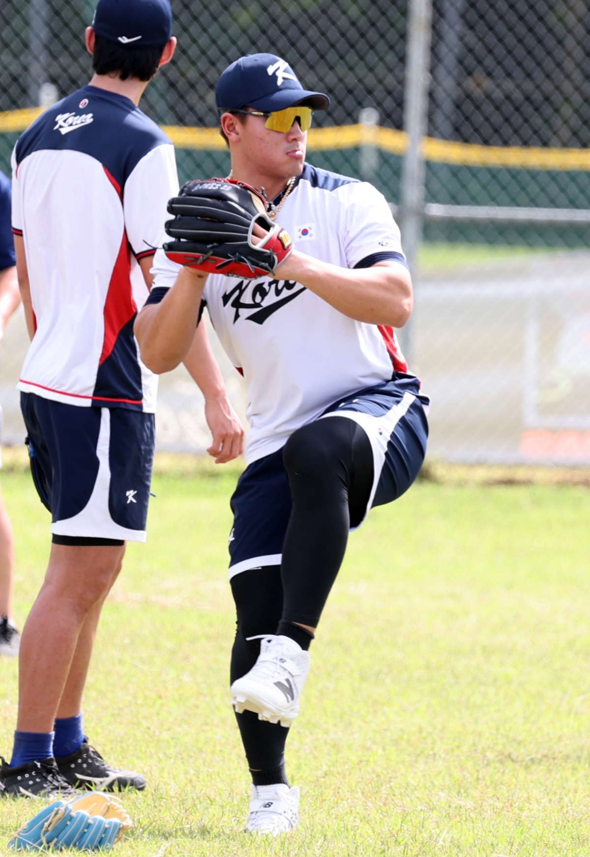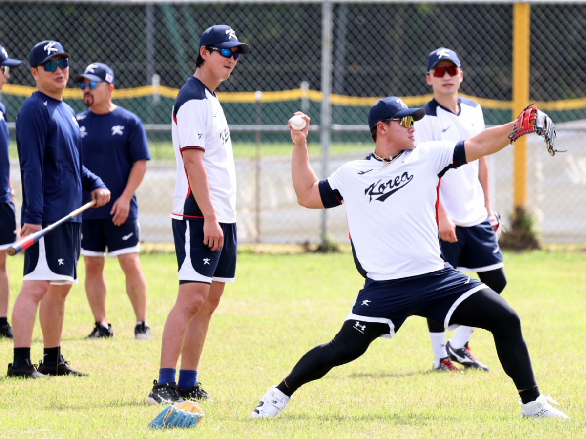 2026년 1월 12일 사이판 올레아이 스포츠 컴플렉스에서 열린 야구대표팀 전지훈련 3일차 훈련에서 구자욱이 캐치볼을 하는 안현민을 지켜보고 있는 모습이 포착되었다.