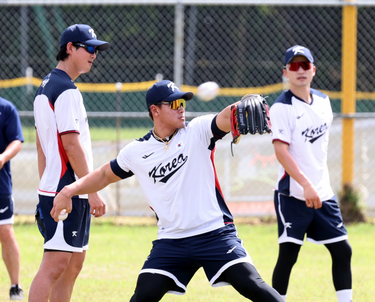 야구대표팀 구자욱이 12일 사이판 올레아이 스포츠 컴플렉스에서 열리는 전지훈련 3일차훈련에서 캐치볼을 하는 안현민을 쳐다보고 있다. 2026.01.12.