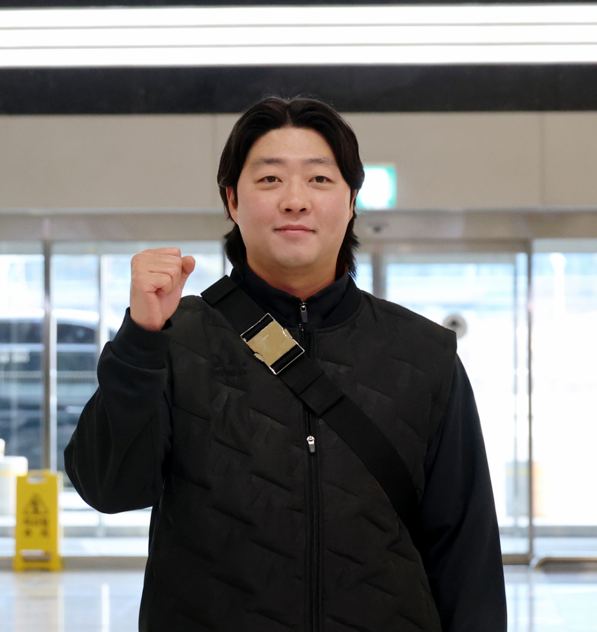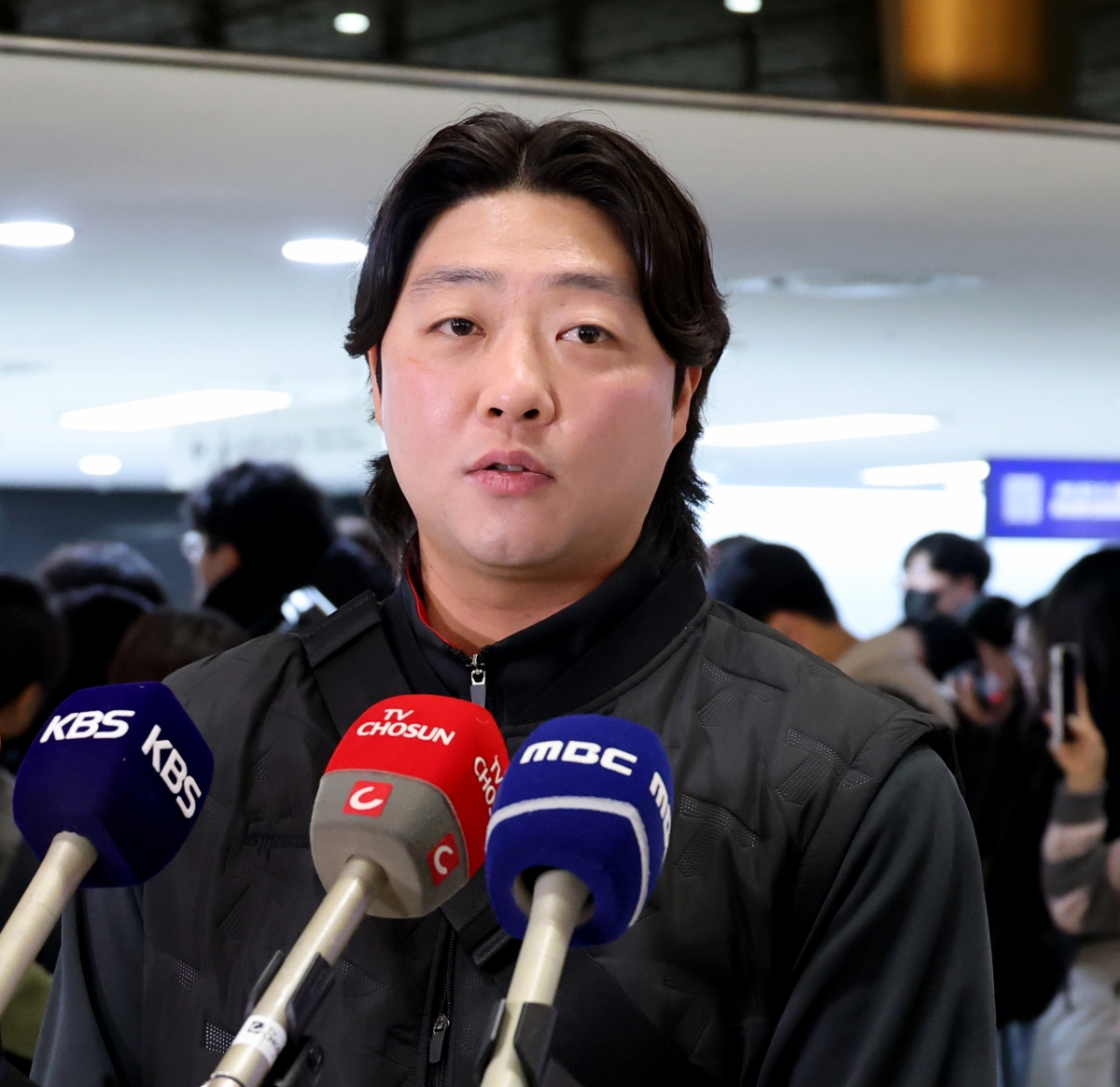 한화에서 기아로 FA 이적한 김범수가 23일 김포공항을 통해 일본으로 출국하고 있다. 출국전 기자회견과 포토타임을 갖는김범수. 202601.23.