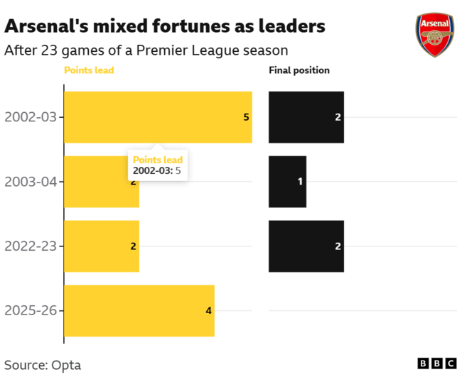 영국 ‘BBC’는 27일(한국시간) 아스날의 현재 위치를 과거와 나란히 놓고 우승 가능성을 분석했다. 최근 맨체스터 유나이티드전 패배로 아스날은 리그 3경기 연속 무승에 빠졌다. 단순한 결과 이상의 신호다. 흐름이 흔들릴 때마다 반복돼온 장면들이 팬들의 기억을 자극한다.