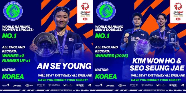 전영오픈은 29일(한국시간) 공식 소셜 미디어(SNS)를 통해 현지시간으로 오는 3월 3일부터 영국 버밍엄에서 열리는 2026 요넥스 전영오픈의 티켓 판매를 독려하며 한국 선수들을 포스터 메인에 내걸었다.