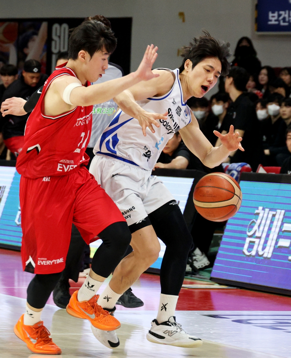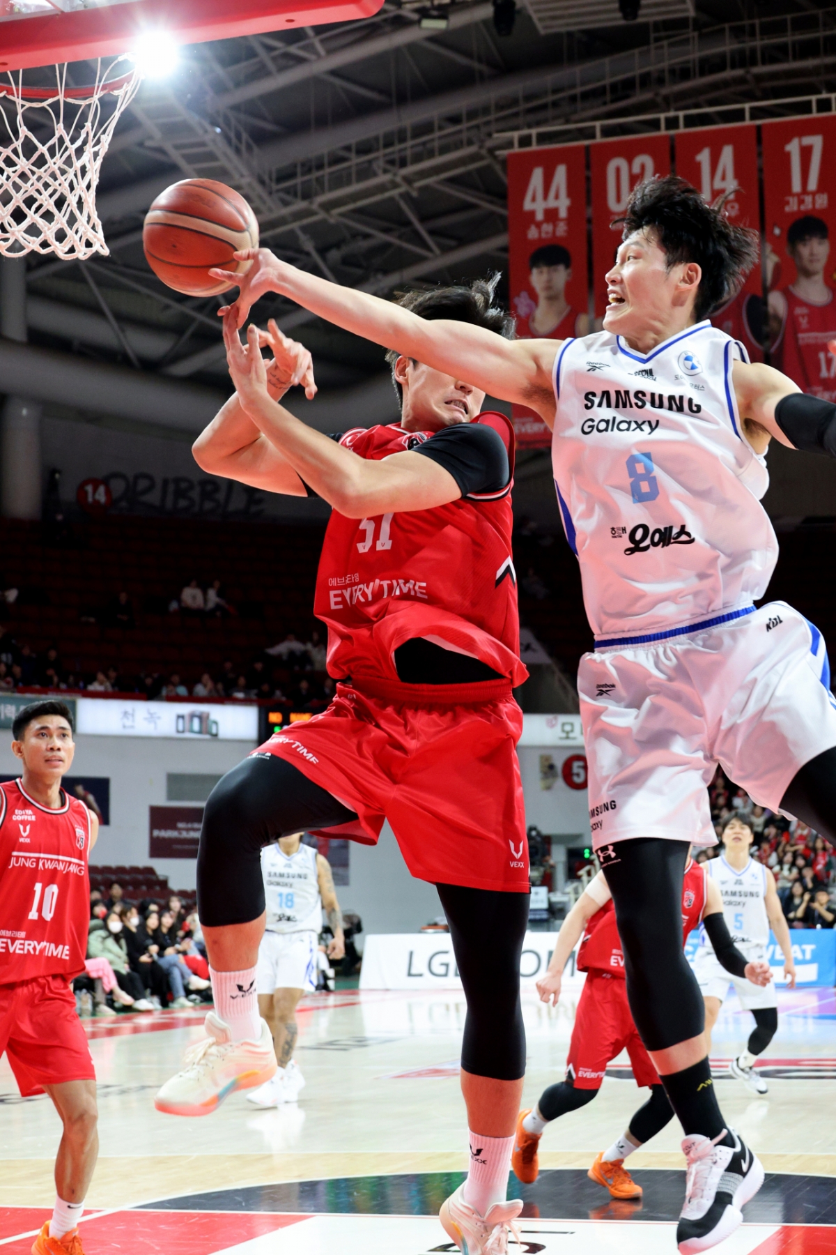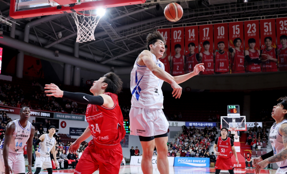 삼성 이원석이 29일 안양체육관에서 열린 2025-2026 LG전자 프로농구 정관장과 삼성의 경기 4쿼터 50초를 남기고 레이업슛을 시도하는 문유현을 슛블록으로 저지하고 있다.