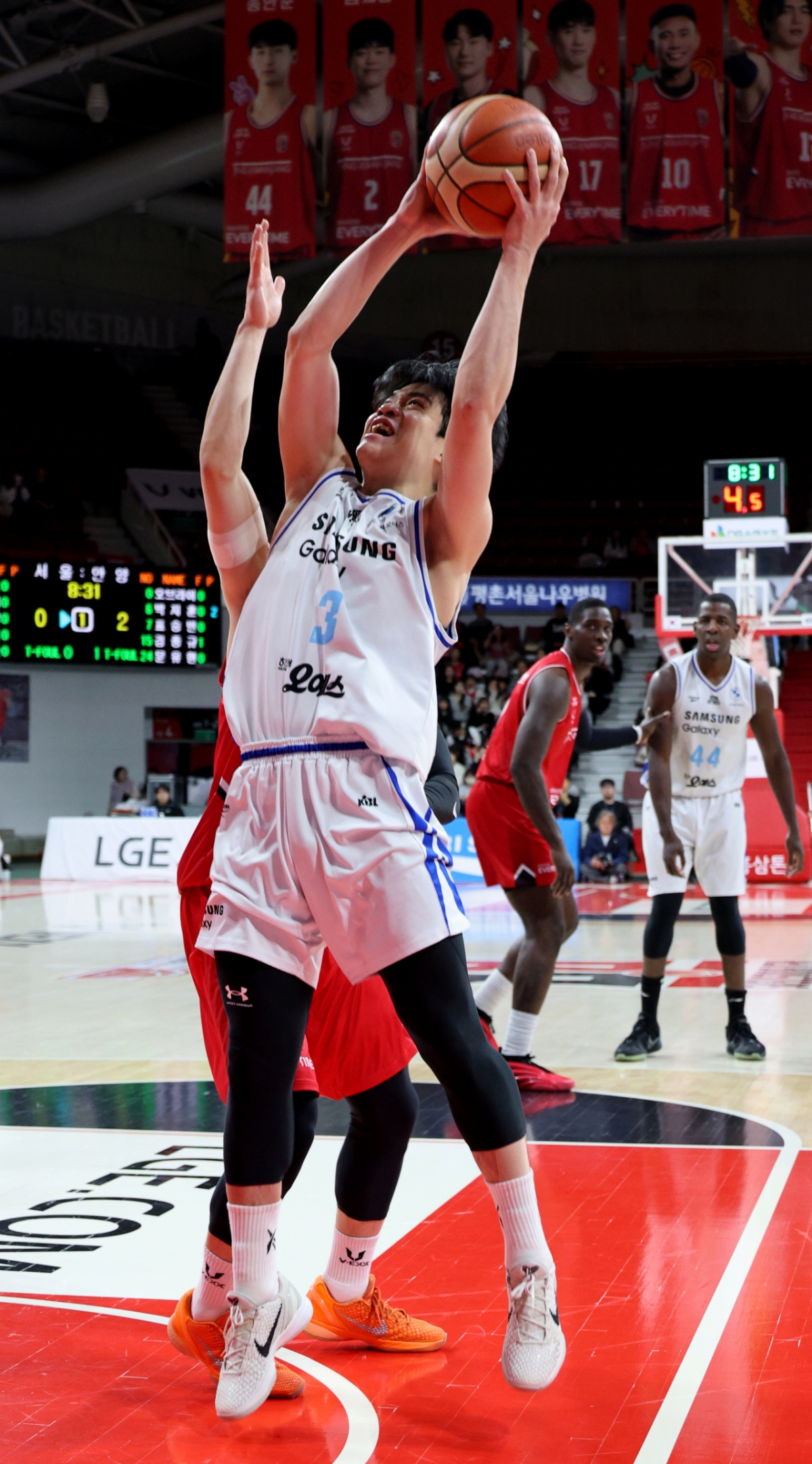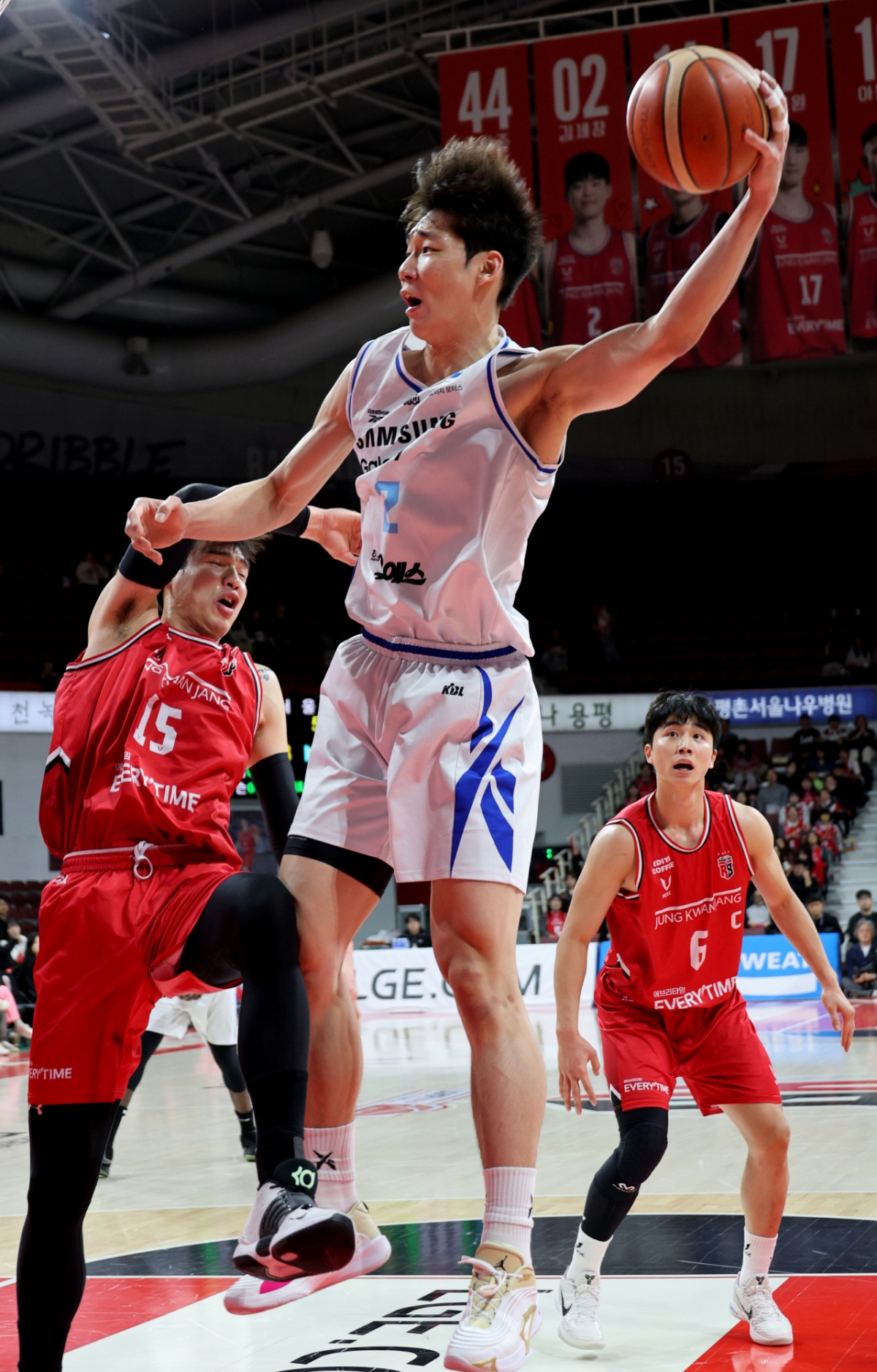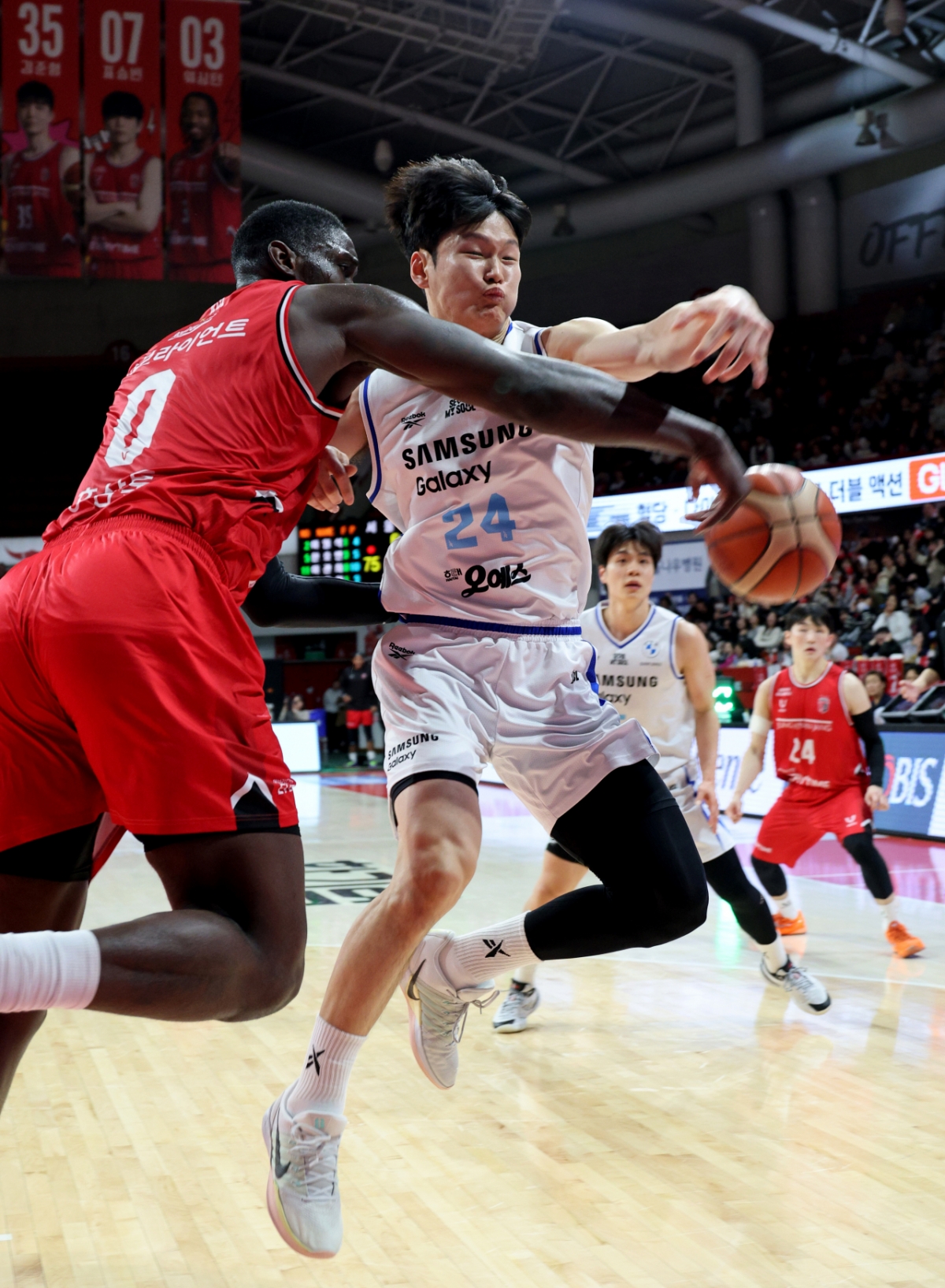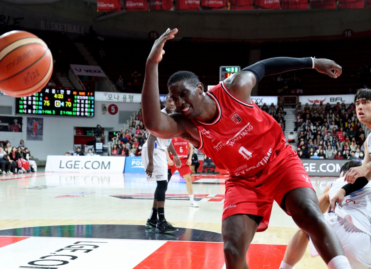 정관장 오브라이언트가 29일 안양체육관에서 열린 2025-2026 LG전자 프로농구 정관장과 삼성의 경기에서 이원석의 얼굴을 치고 있다. 2026.01.29.