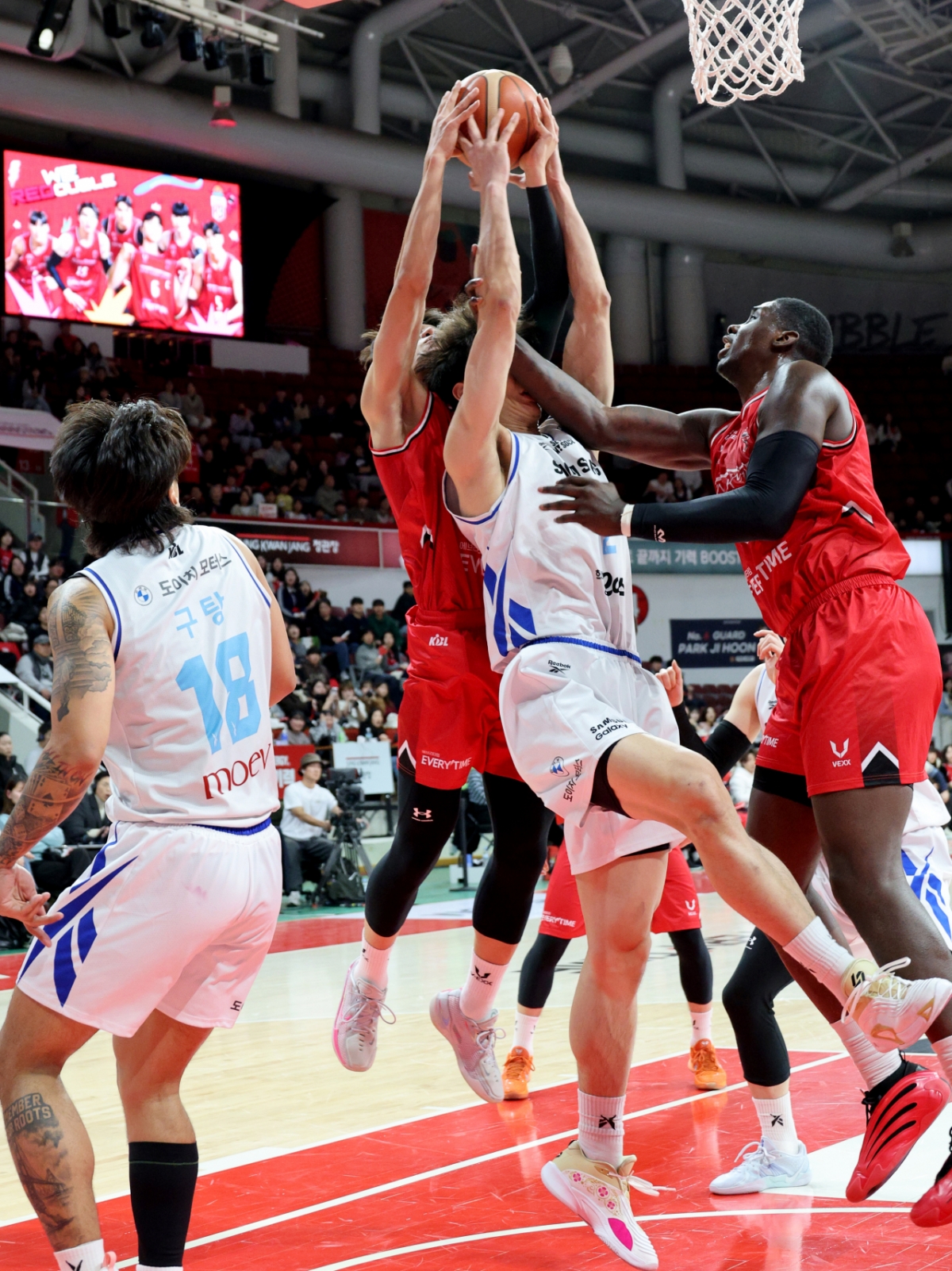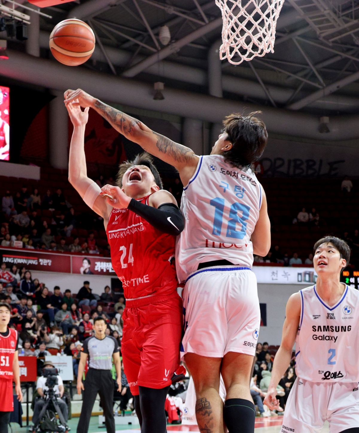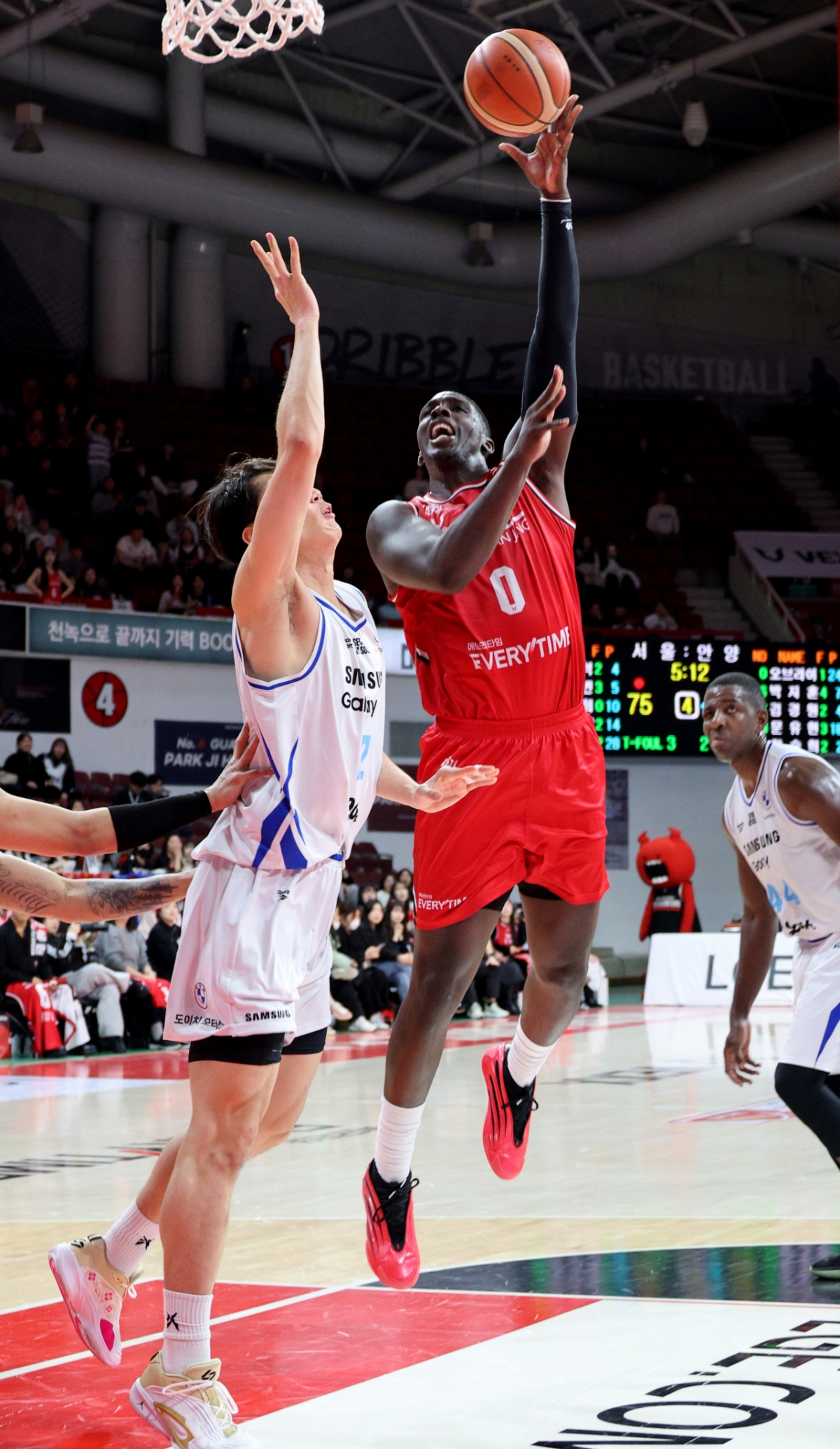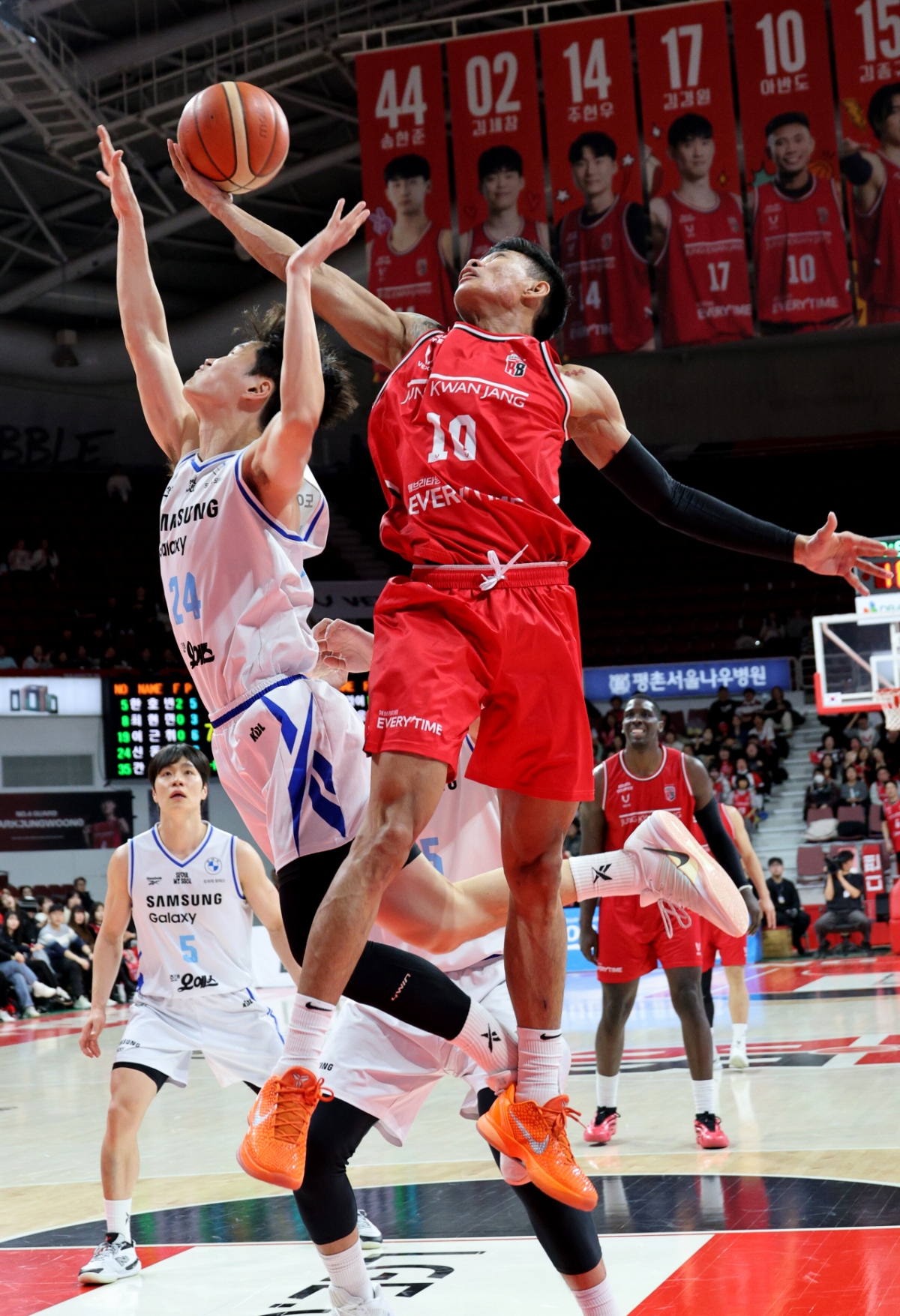 정관장 오브라이언트가 29일 안양체육관에서 열린 2025-2026 LG전자 프로농구 정관장과 삼성의 경기에서 이원석의 얼굴을 치고 있다. 2026.01.29.