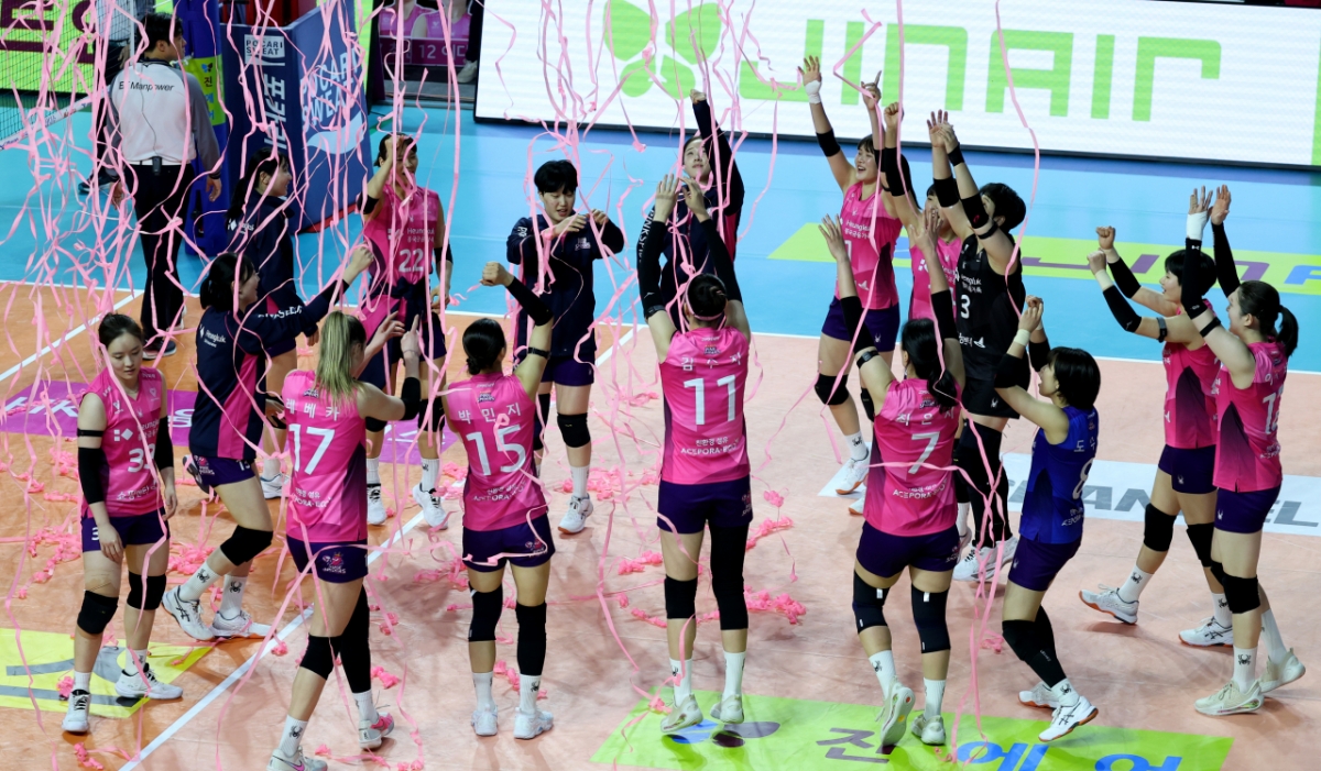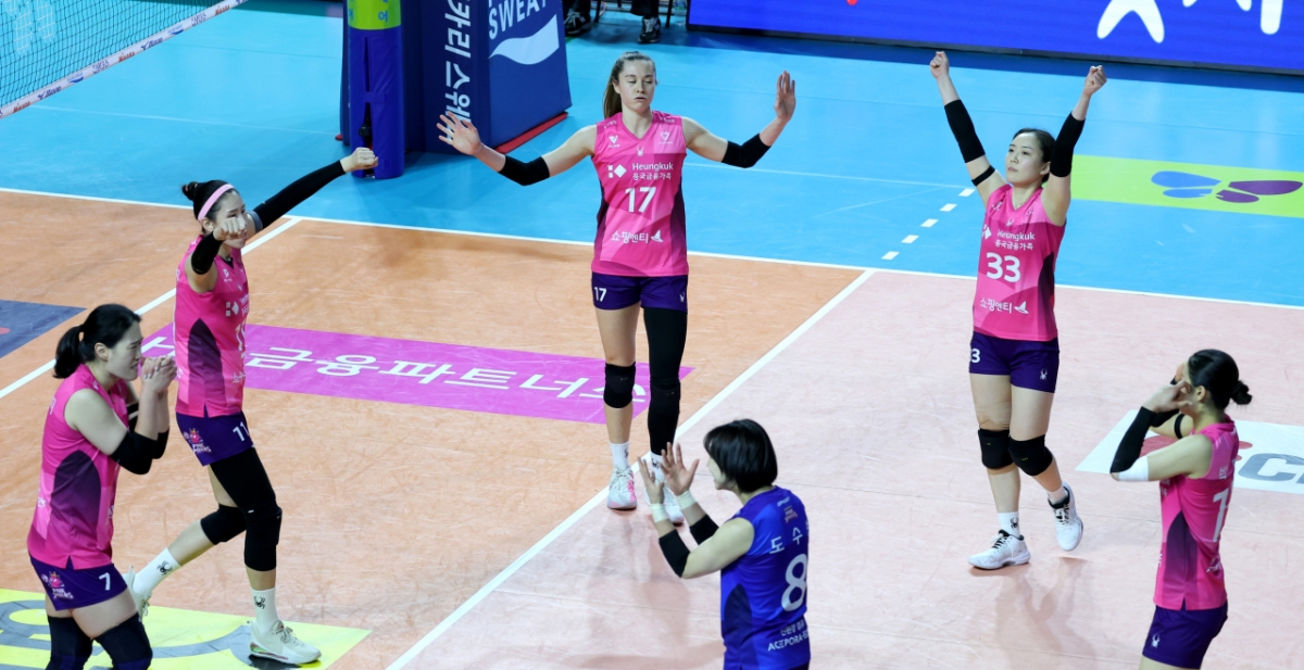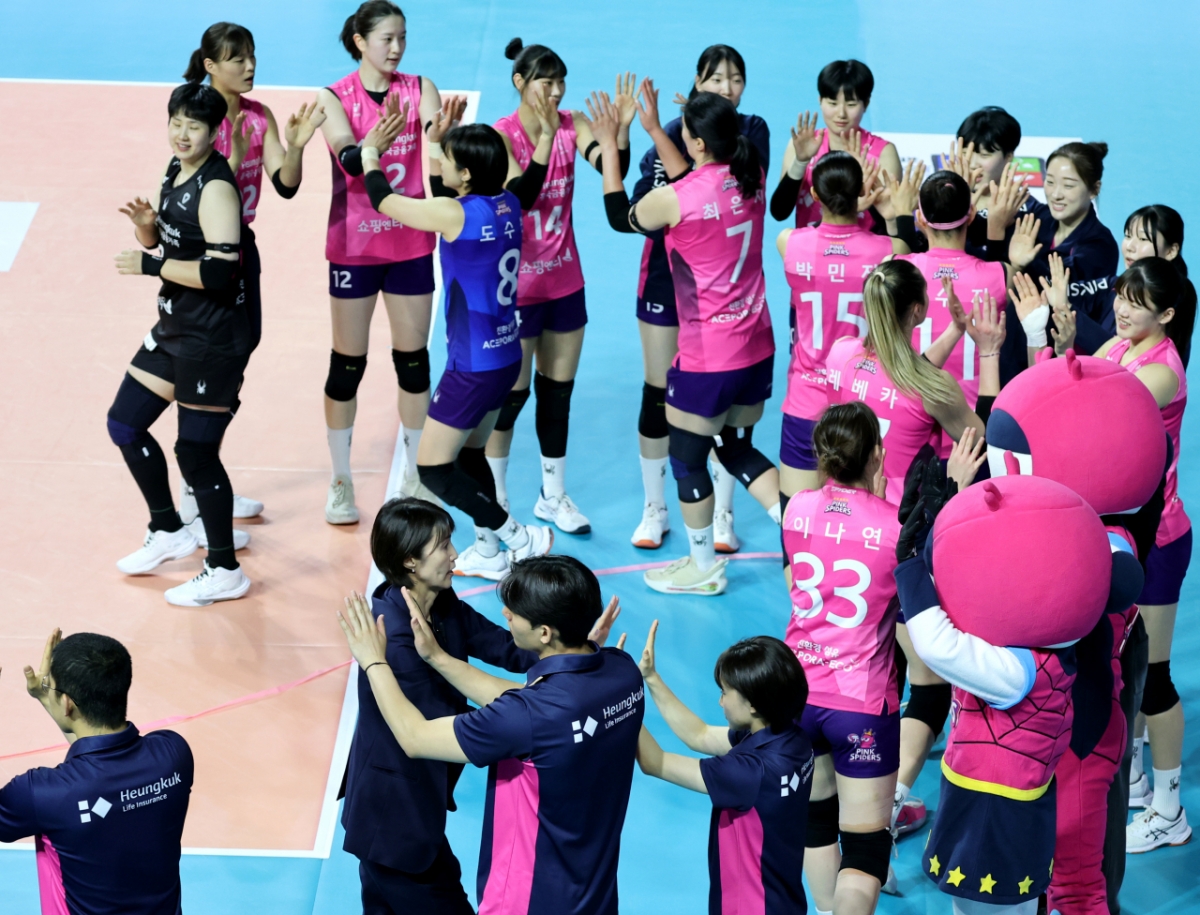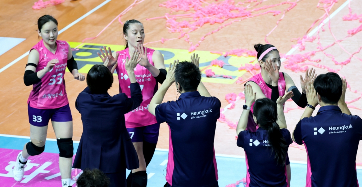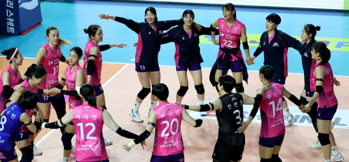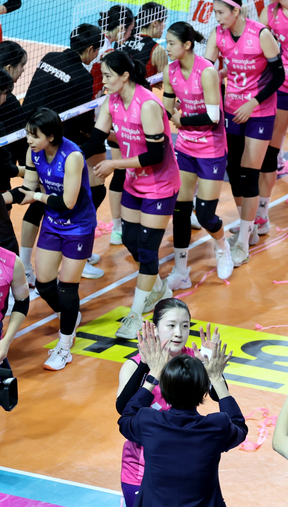 흥국생명 최은지, 레바카 등 선수들이 2일 삼산월드체육관에서 열린 2025-2026 진에서 V리그 흥국생명과 페퍼저축은행경기에서 세트스코어 3-1로 승리한 후 자축하고 있다.
