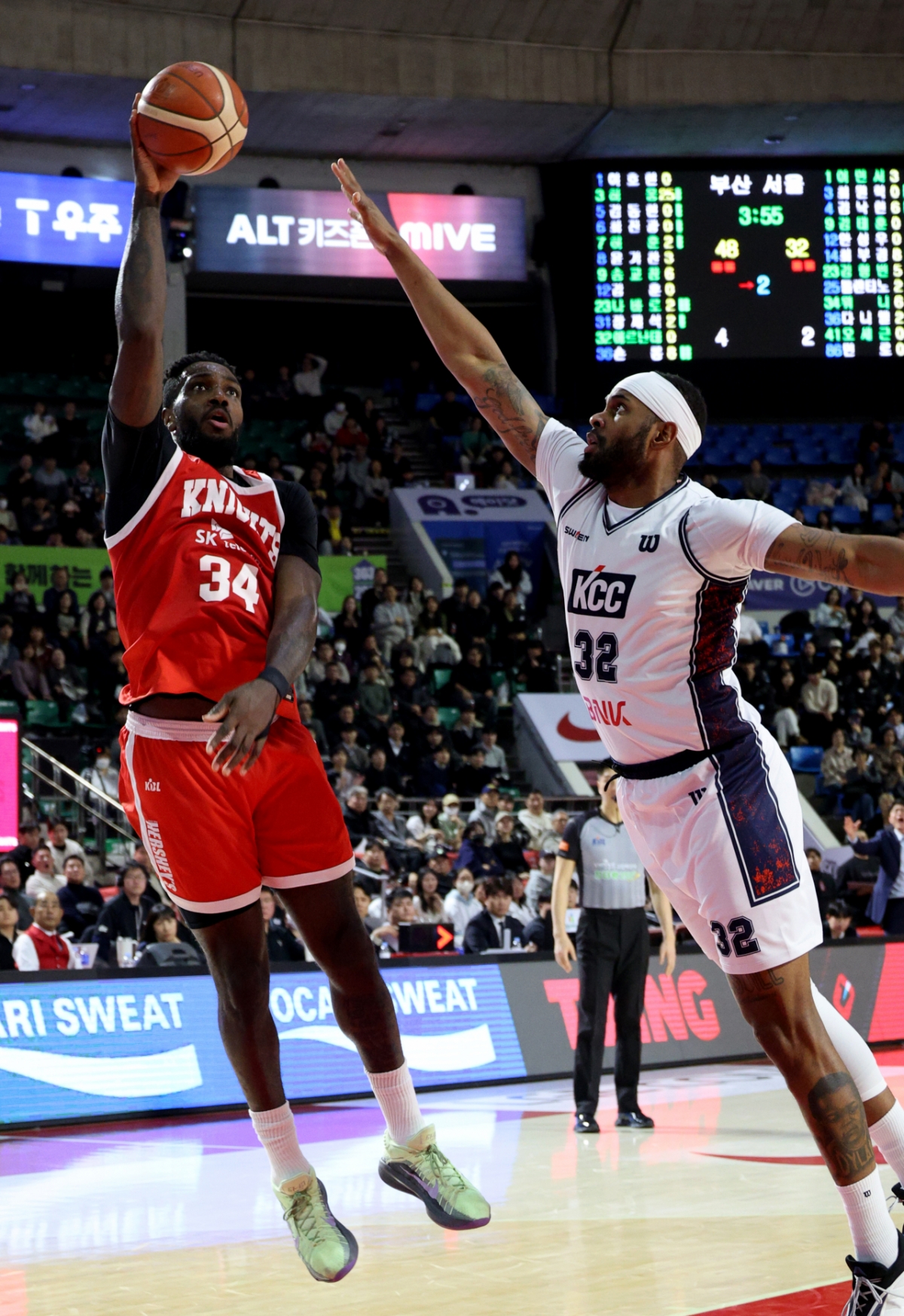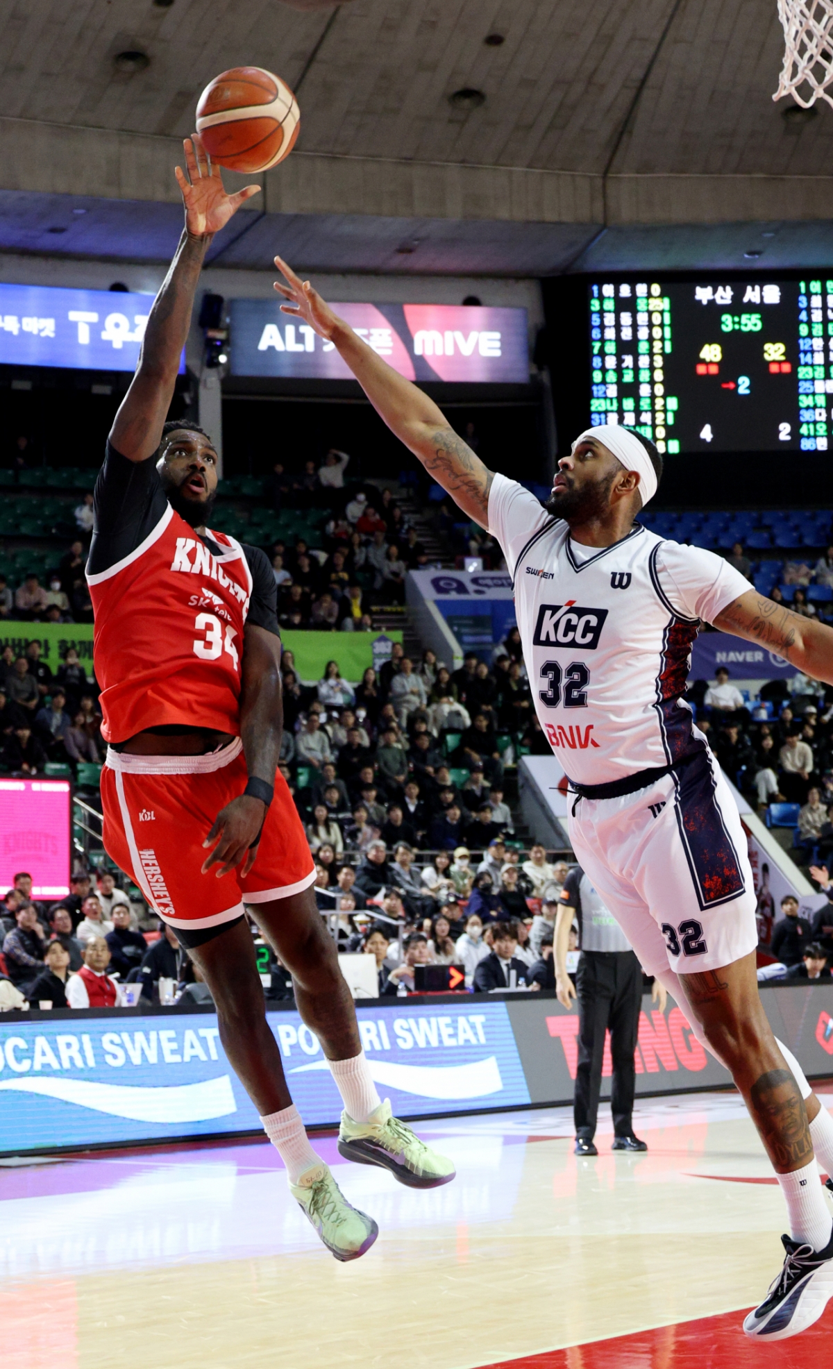 SK 워니가이가 2026년 2월 2일 실학생체육관에서 열린 2025-2026 LG전자 프로농구 서울SK와 부산KCC 경기에서 에르난데스를 피해 훅슛을 시도하고 있다.