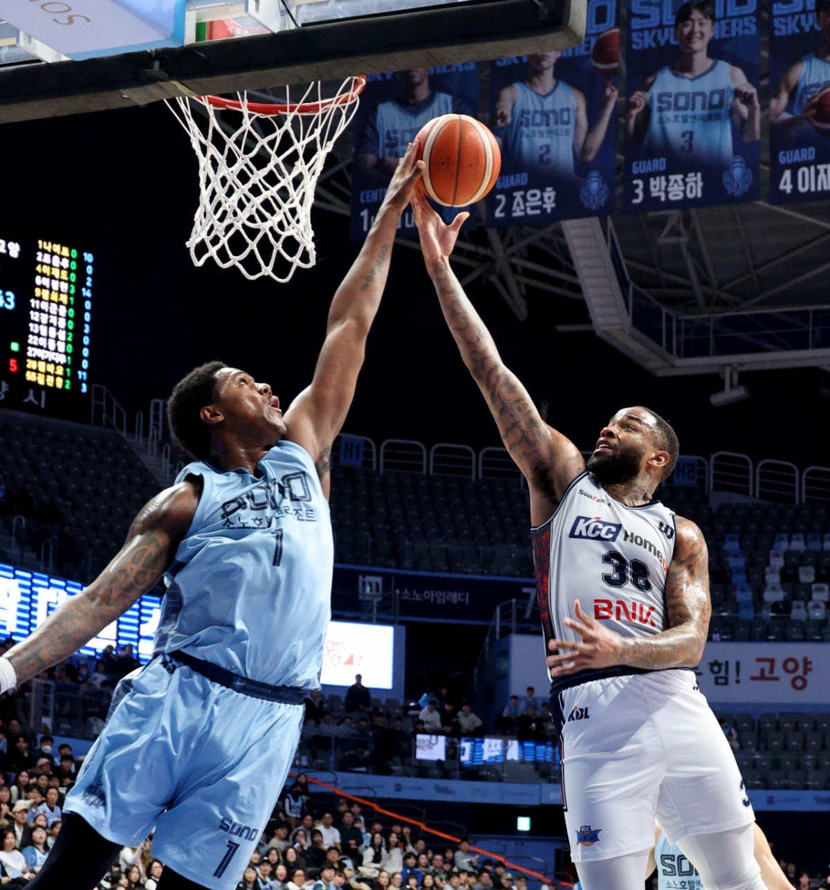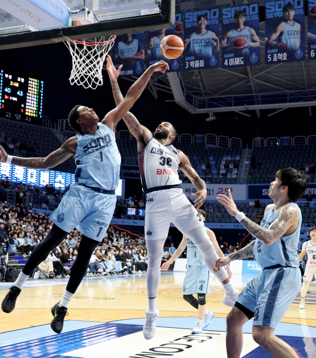 KCC 숀롱이 고양소노아레나에서 열린 2025-2026 LG전자 프로농구 고양소노와 부산KCC 경기에서 슈팅을 시도하자 나이트가 블록하는 장면이 2026년 2월 4일 촬영되었습니다.