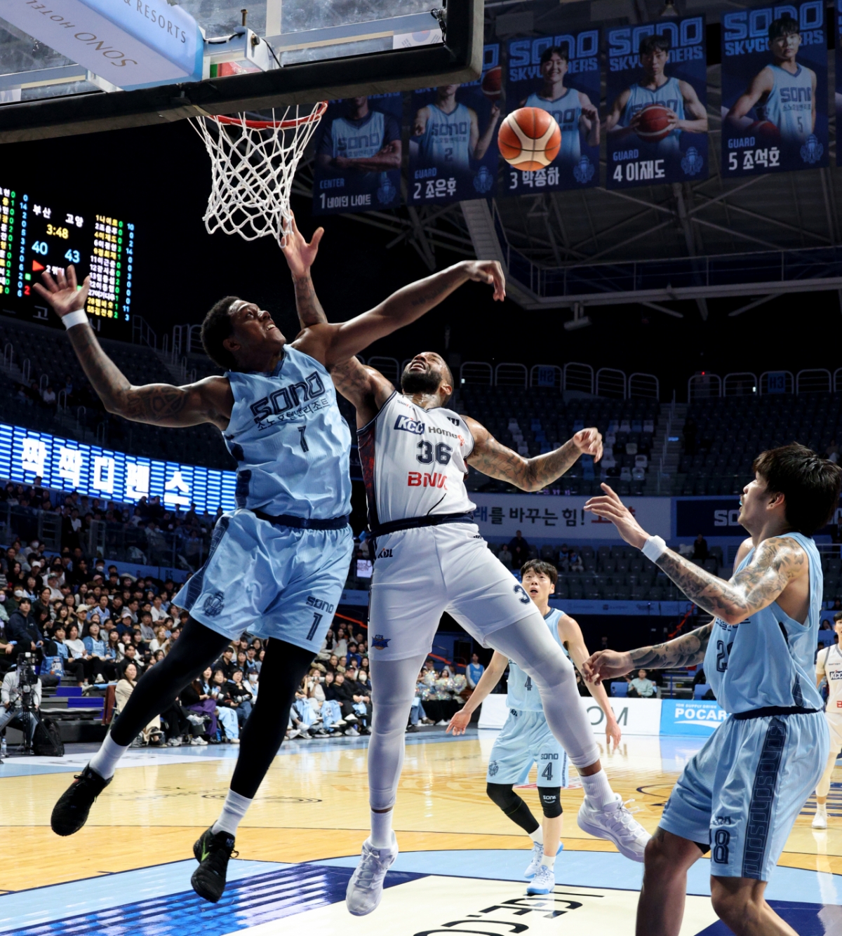 KCC 숀롱이 4일 고양소노아레나에서 열린 2025-2026 LG전자 프로농구 고양소노와 부산KCC 경기에서 슈팅을 시도하자 나이트가 블록하고 있다. 2026.02.04.